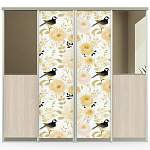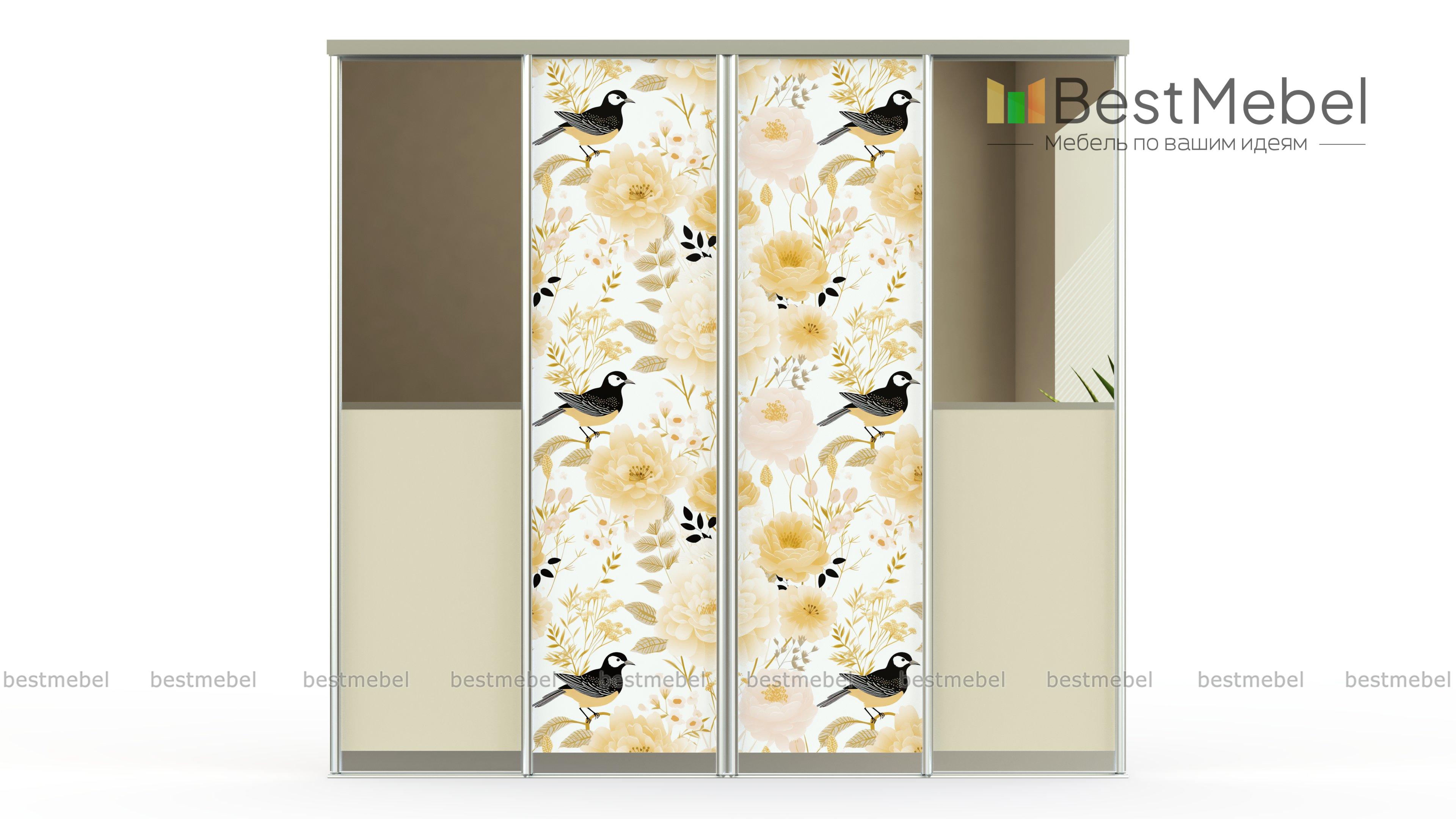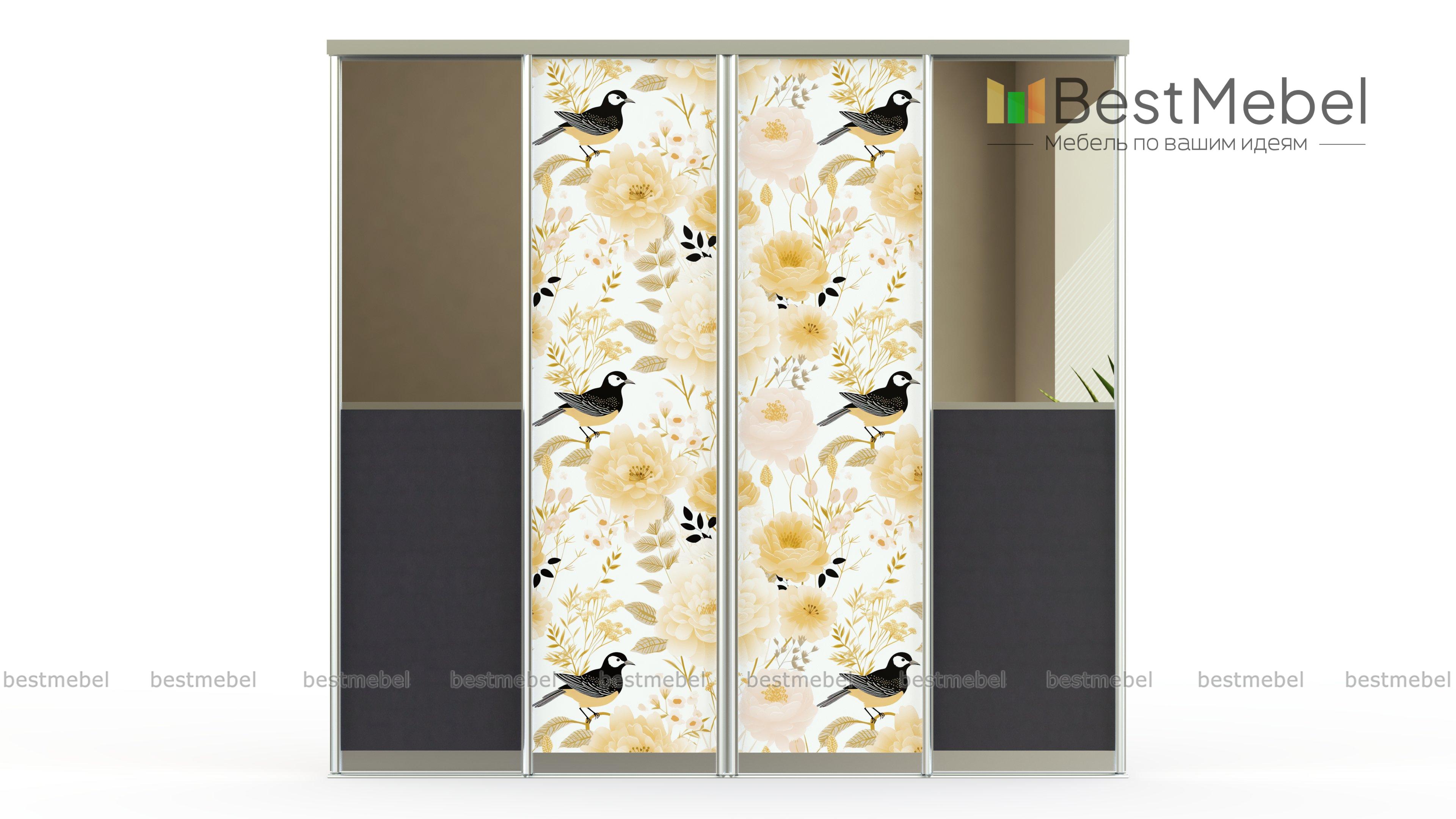 Двери-купе Флайт 1 BMS - это два полотна с цветами и птицами в духе шебби и два комбинированных. Природные древесные тона в отделке фасада создают атмосферу уюта, а зеркала придают помещению глубину. Каркасы из алюминиевого профиля в цвете серебро универсальны и легко сочетаются с любым оформлением, делают конструкцию прочной, долговечной и простой в монтаже. Купить двери-купе Флайт 1 BMS, изготовленные по вашим размерам, приглашаем к нам в интернет-магазин.