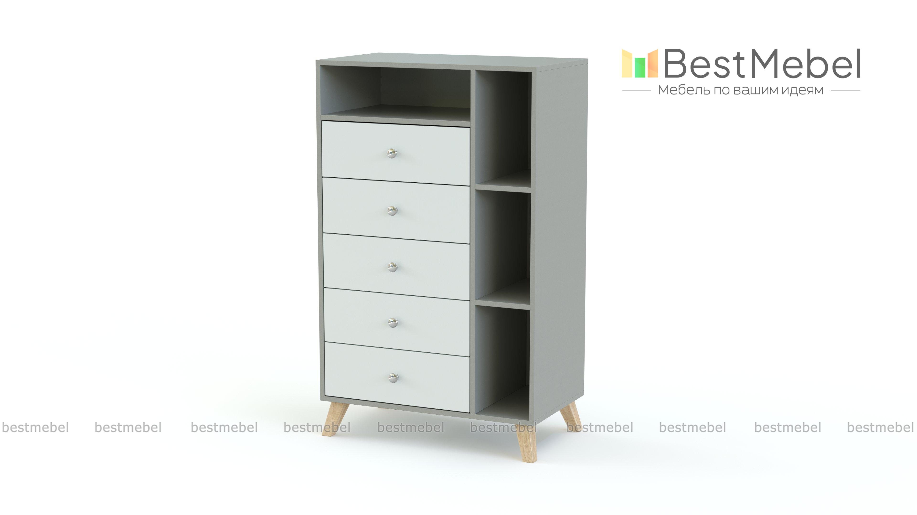 Комод Аллегро 17 BMS отличается компактными размерами и вместительностью за счет высоты. Яркая современная модель не только эффектно продемонстрирует предметы декора и книги, но и разместит множество бытовых мелочей. Комод на высоких устойчивых ножках оборудован пятью глубокими выдвижными ящиками и четырьмя открытыми секциями разных размеров. Купить комод Аллегро 17 BMS для меблировки гостиной или спальни вы сможете выгодно в нашем интернет-магазине.