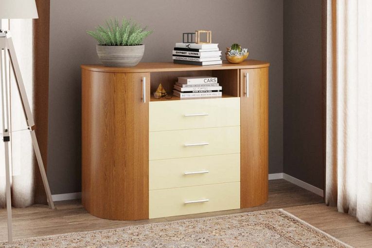 Комод радиусный Этюд 17 BMS дополнит интерьер гостиной или спальни удобной системой хранения и поможет оформить зону ТВ. Комбинированная модель оборудована просторной скругленной столешницей, нишей под аппаратуру, четырьмя выдвижными ящиками и двумя распашными отделениями с выпуклыми радиусными фасадами. В оформлении комода гармонично сочетаются древесные тона и бежевый глянец. Купить комод радиусный Этюд 17 BMS приглашаем на сайт нашего интернет-магазина.