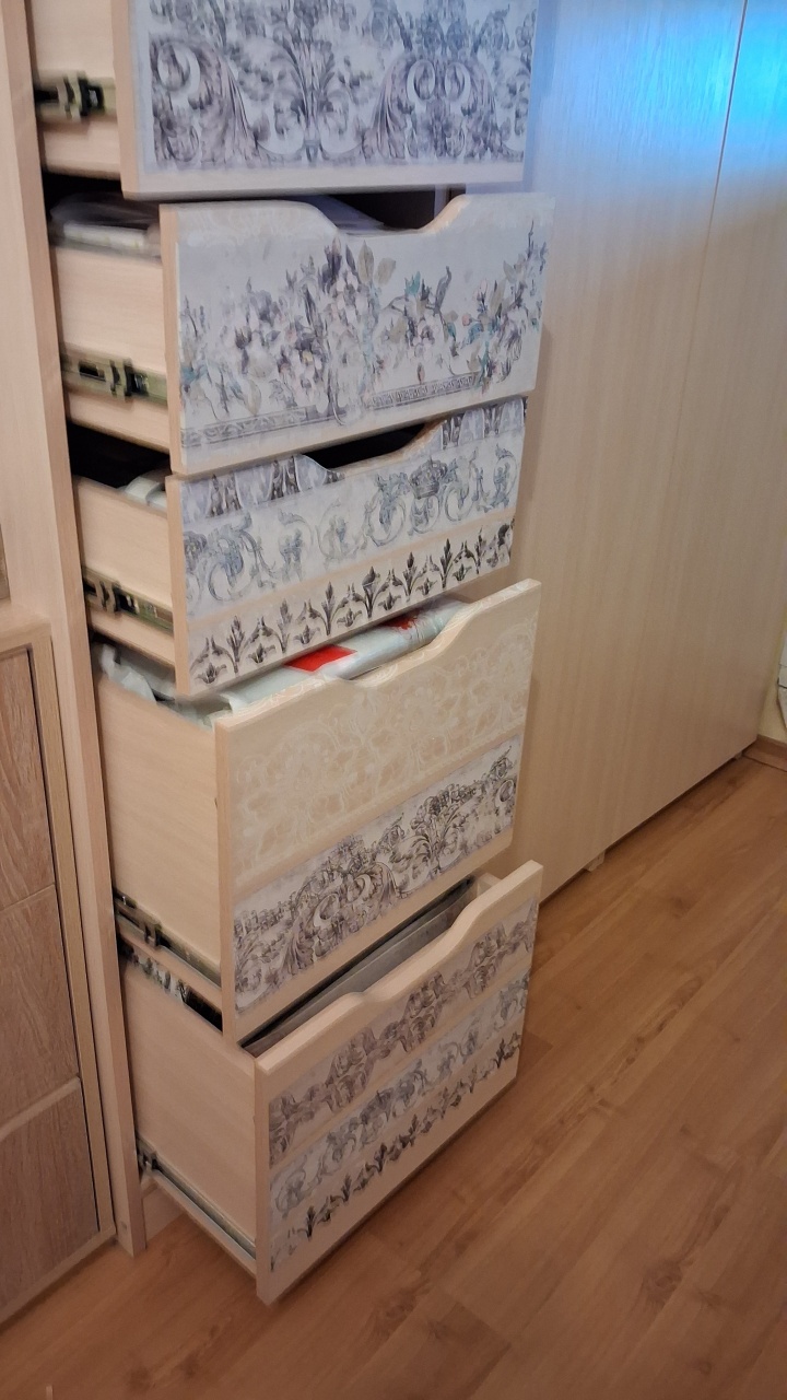 Комод заказала по своим размерам.Получилось как надо.Хотелось бы боковые полки выше.