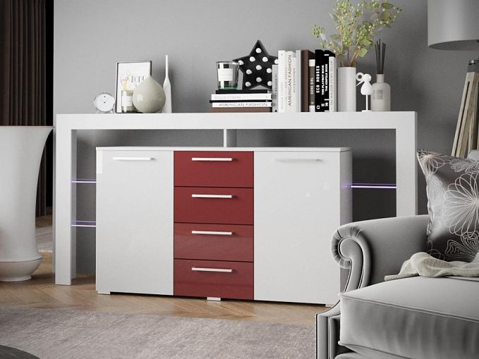 Футуристичный дизайн комода Riva II plus BMS станет идеальным дополнением современных интерьеров в стиле хай-тэк и минимализм. Четыре выдвижных ящика в центре располагаются по соседству с вместительными распашными отделениями и необычными, полностью открытыми стеклянными полками. Глянцевые фасады выполнены в контрастных цветах, фурнитура удобная и лаконичная, а светодиодное освещение придаст атмосферности не только предметам декора, но и гостиной в целом. Расцветку корпуса и фасадов вы сможете подобрать в нашем интернет-магазине.