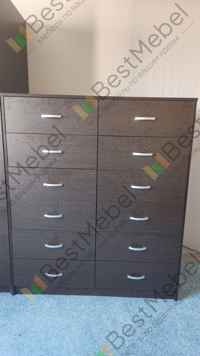 Заказ номер 00000687652. Отличный комод получился. 12 больших и удобных ящиков. И выглядит превосходно - в цвет другой мебели кроме того круто и основательно. Спасибо, сотрудникам магазина, что предложили сделать все ящики двойными - так гораздо лучше и вещи сортировать удобней. Отмечу удивительную скорость производства. Буквально еще пару дней назад согласовал проект - и уже звонят говорят когда доставят. И это уже 6ой элемент мебели который я заказал в этом магазине!