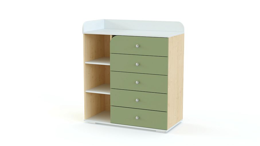 Пеленальный комод Арка 2 BMS с расположенными углом защитными бортиками позволит укладывать малыша вдоль задней стенки и боком к маме. Пять выдвижных ящиков, один из которых с полукруглым вырезом, и три открытые секции разместят все необходимые под рукой средства гигиены, пеленки, одежду и игрушки. Оригинальный дизайн в сочетании с широким выбором цветовых решений позволяет гармонично вписать комод в любую детскую. Купить пеленальный комод Арка 2 BMS по доступной цене приглашаем в наш интернет-магазин.