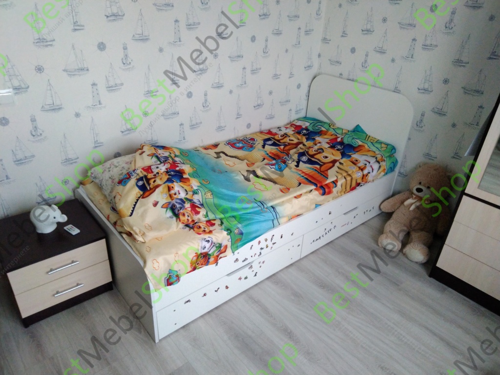 Хорошая кровать, крепкая. Детали без сколов. Собирается быстро. Вместительные ящики.