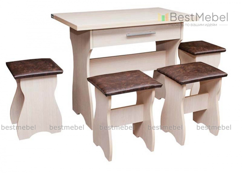 Практичный подход к организации обеденной зоны в малогабаритном помещении обеспечит комплект Флоренс-1 BMS. Классический стиль группы понравится поклонникам традиционных решений и домашнего уюта. В набор входят раскладной компактный столик и четыре табурета с комфортными сиденьями, обтянутыми мягкой искусственной кожей. При помощи поворотно-раскладного механизма столешница может быть увеличена вдвое. Для хранения необходимых под рукой мелочей предусмотрен выдвижной ящик.