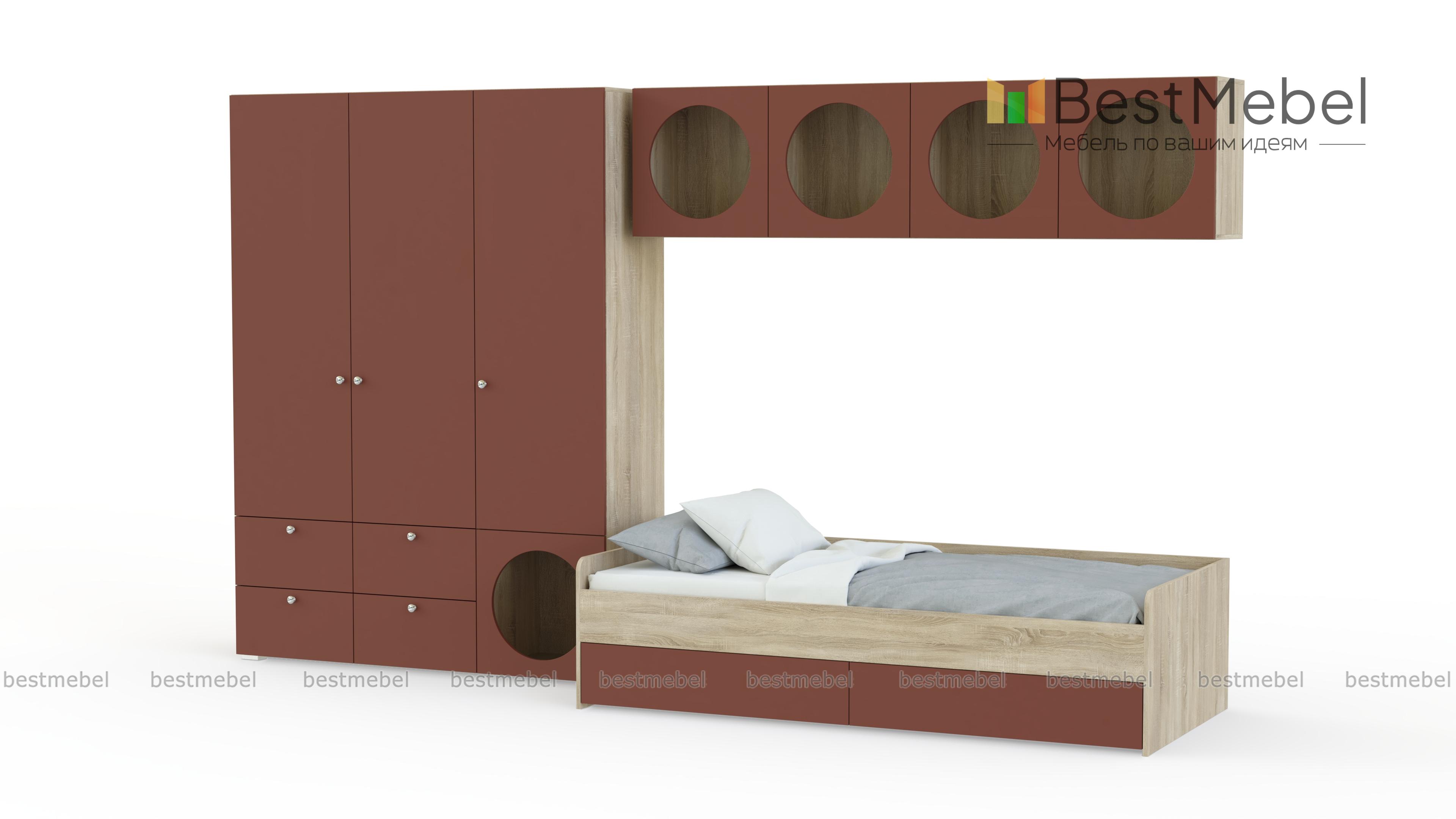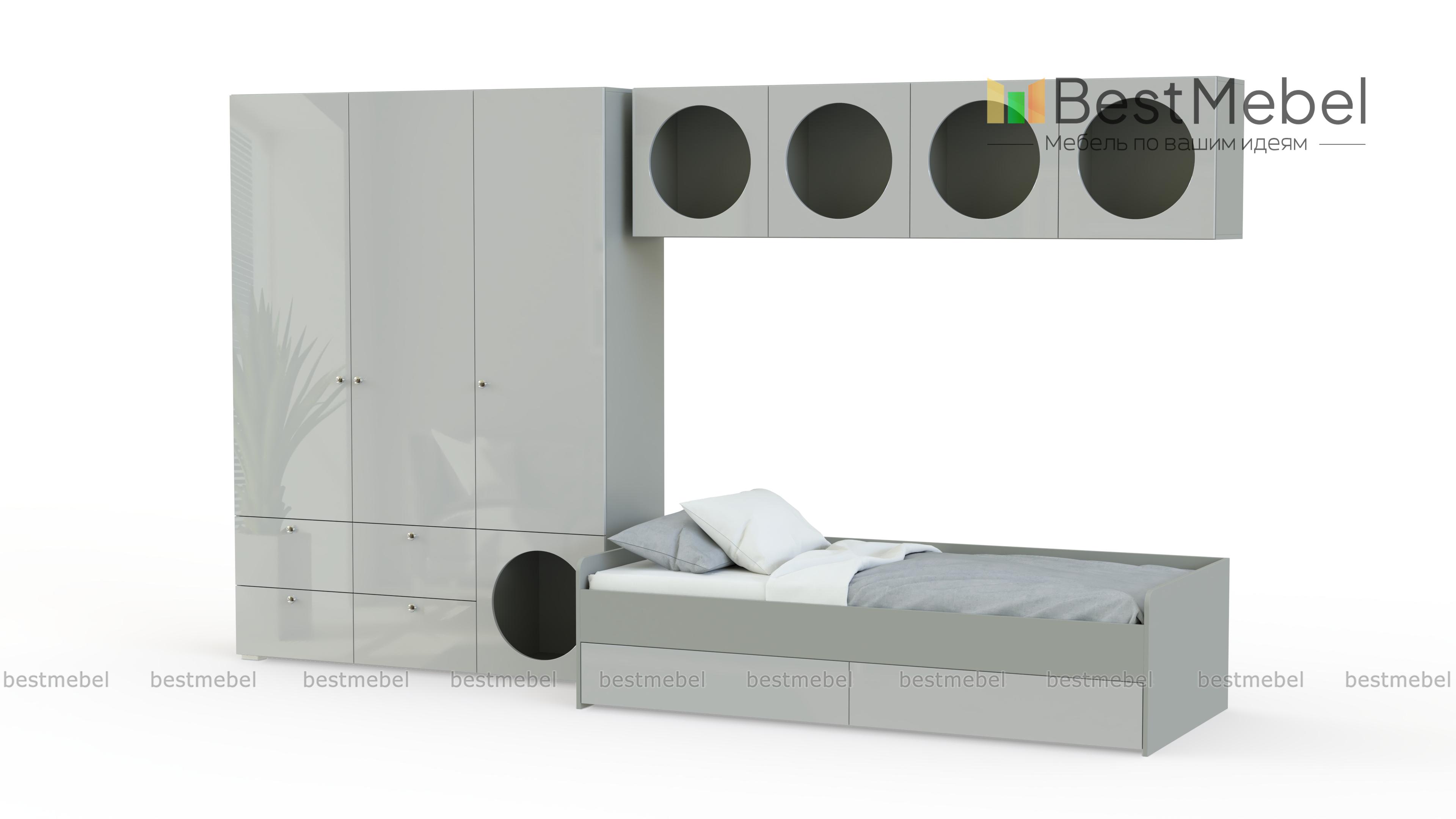 Детская комната Авелин 5 BMS — это функциональная современная мебель с ярким дизайном. Вместительный распашной шкаф с четырьмя ящиками и оригинальные открытые полки помогут организовать хранение гардероба ребенка, игрушек и учебных пособий. Для сна и отдыха днем прекрасно подходит кровать, под которой скрыты два выдвижных отсека для белья. Купить детскую комнату Авелин 5 BMS вы сможете в нашем интернет-магазине, подобрав любые оттенки из каталога и тип ручек.