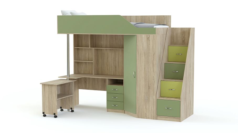 Детская кровать-чердак Мерабель 1 BMS – отличная модель с потрясающей функциональностью. В комплект входят все элементы, необходимые для гармоничного развития малыша. Большой шкаф интересной формы вместит кучу детских вещей. На спальное место, скрытое за фигурной панелью, нужно забираться по надежной лестнице – тумбе. Её вместительные ступени станут домом для многочисленных игрушек и прочих детских богатств. Рабочий стол имеет полный арсенал для полноценного учебного процесса: это и полочки для книг, и тумба с ящиками для тетрадок и канцелярских мелочей. Обратите внимание на пристройку к столу, которая легко крутится на никелированной опоре, при необходимости увеличивая рабочую поверхность стола почти вдвое. Ребенок с удовольствием будет раскладывать свои вещи по полочкам, поддерживая порядок в своем собственном мирке. Купить детскую кровать – чердак Мерабель 1 BMS по минимальной цене можно на нашем сайте.