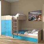 Двухъярусная кровать Море 14 BMS – замечательный вариант для организации зоны отдыха для двоих детей. Интересно решено размещение постелей, соединенных лестницей с хромированными ступенями. Они расположены не строго друг под другом, что создает больше возможностей для игр, общения. Под основанием верхнего спального места предусмотрена вместительная система хранения для гардероба владельцев. Три отделения: платяное со штангой, бельевое с полками, в центре – 4 ящика на направляющих. Нижняя кроватка оборудована выкатными элементами, где удобно разложить игрушки, постельный текстиль.