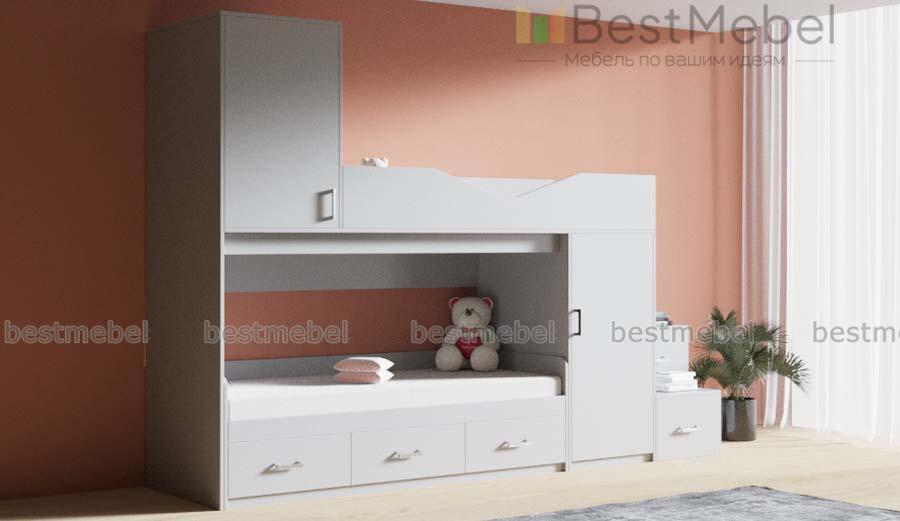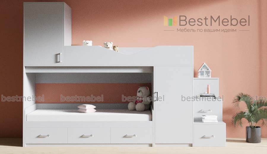 Двухъярусная кровать в детскую Валли 7 BMS с нейтрально-серыми фасадами оттенка металлик поможет создать стильный интерьер в комнате мальчиков. На втором ярусе композиции располагается спальное место с бортиком и распашной шкафчик, а первый занят кроватью с тремя бельевыми ящиками в основании, пеналом для одежды и устойчивой лестницей-комодом. Удобная система хранения позволит аккуратно разместить вещи и легко поддерживать в комнате порядок. Купить двухъярусную кровать в детскую Валли 7 BMS приглашаем в наш интернет-магазин по доступной цене.