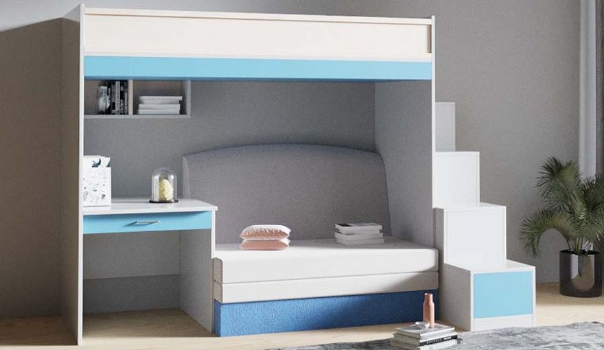 Кровать с диваном Никса 2 BMS – это не только комфортная зона отдыха, но и удобная система хранения, и рабочее место. Композиция 3 в 1 объединила расположенное на втором ярусе спальное место с защитным бортиком, раскладной диван, письменный столик с книжными полками и приставную лестницу-комод с вместительными ящиками для игрушек и прочих детских вещей под ступеньками. Выполненная в светлых тонах, модель делает небольшую комнату визуально просторнее. Купить кровать с диваном Никса 2 BMS приглашаем в наш интернет-магазин.