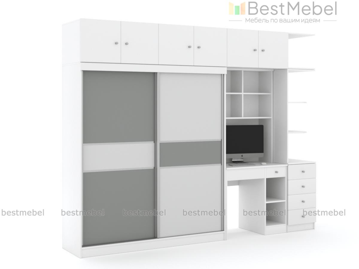 Шкаф-купе со столом Вавилон 6 BMS поможет вам рационально организовать пространство, объединив продуманную систему хранения и рабочую зону. Многофункциональная линейная композиция включает в себя двухдверный шкаф-купе для одежды, распашную антресоль с тремя отделениями, дополненный книжными полками и банкеткой компьютерный столик и секцию с тумбой и радиусными полками для мелочей. Купить шкаф-купе со столом Вавилон 6 BMS, выполненный в сочетании белого и платинового, приглашаем к нам в интернет-магазин.