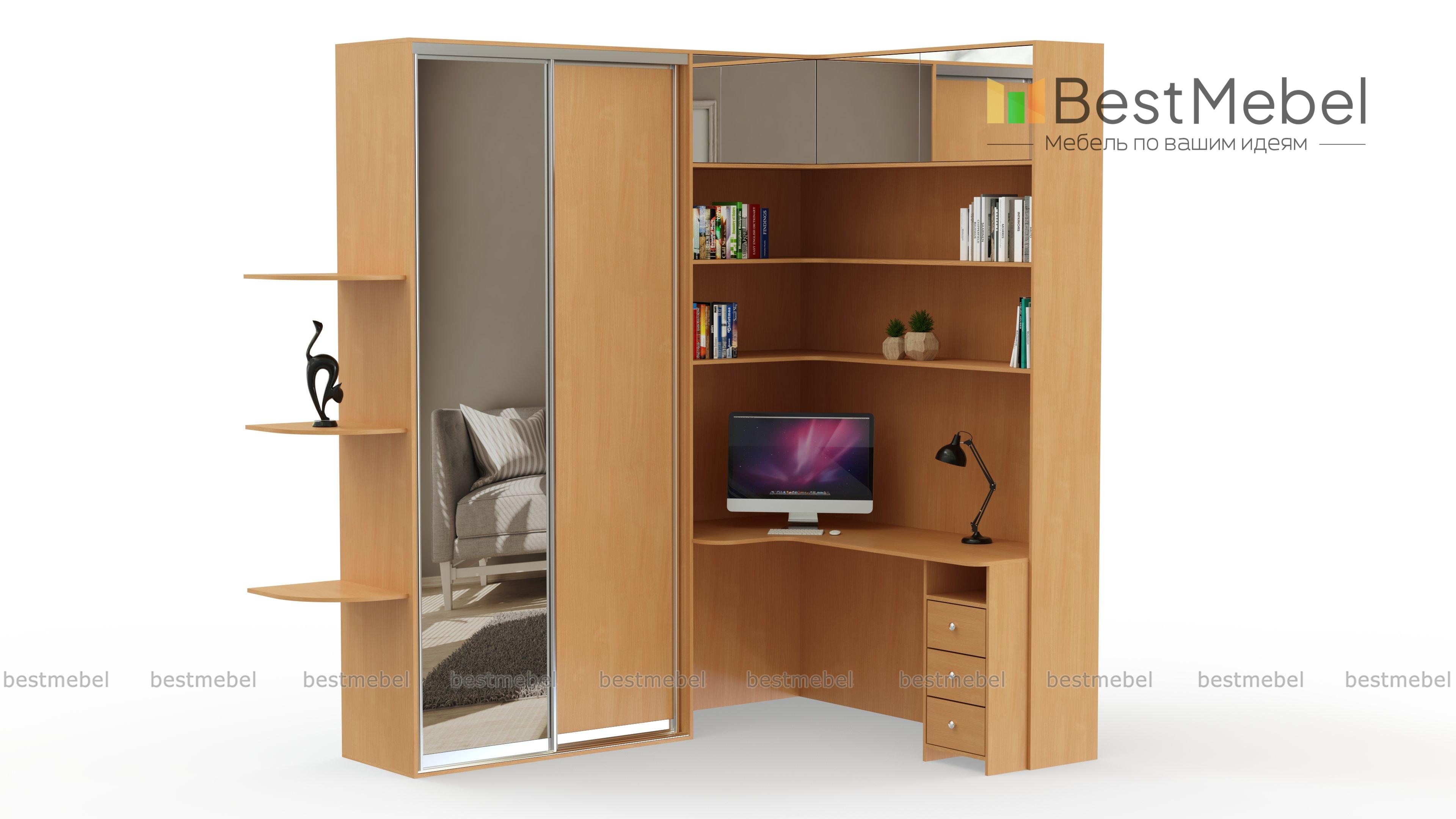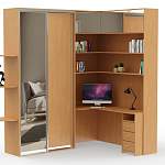 Шкаф угловой с зеркалом и столом Сэт BMS станет разумной альтернативой громоздкой мебели в интерьере небольшой городской квартиры. Практичная композиция включает в себя шкаф-купе для одежды с зеркальной дверцей и торцевыми полками, угловой компьютерный стол с тумбой для канцелярских мелочей и надстройку с глухими и открытыми отделениями. Выполненный в теплых тонах, шкаф создаст комфортную для работы или учебы атмосферу. Купить шкаф угловой с зеркалом и столом Сэт BMS приглашаем в наш интернет-магазин по доступной цене.