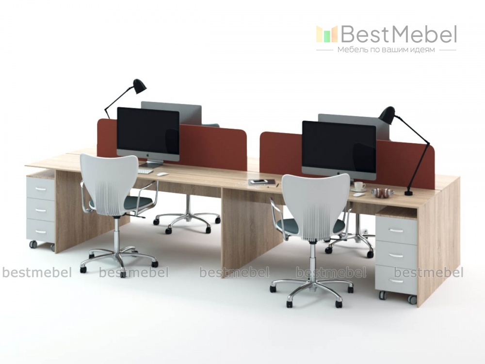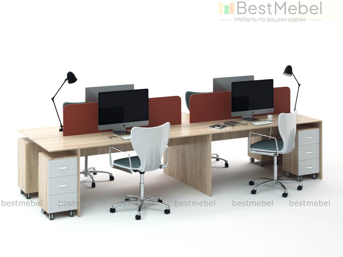 Бенч-система Оникс-1 BMS поможет рационально использовать офисное пространство и оборудовать комфортные рабочие места сразу для четырех сотрудников. Модель с классическими прямоугольными столешницами и широкими устойчивыми опорами-боковинами выполнена в натуральных тонах под древесный массив и дополняется выкатными тумбами для канцелярских мелочей. Настольные перегородки отделяют сотрудников друг от друга, обеспечивая приватность. Купить бенч-систему Оникс-1 BMS по доступной цене вы сможете в нашем интернет-магазине.