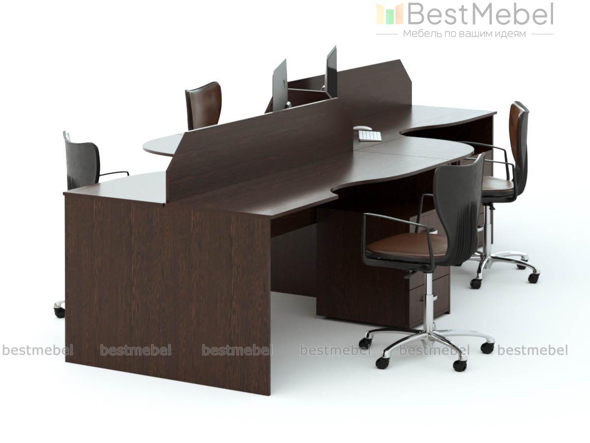 Бенч-система Тим 16 BMS – оригинальное решение для организации пространства современного опен спейса. Композиция на четыре рабочих места включает в себя компьютерные столы со столешницами эргономичной формы, дополненные торцевыми скругленными элементами и мобильными тумбами с ящиками для мелочей. Для обеспечения приватности используются глухие скошенные перегородки. Крупногабаритная конструкция выполнена в темных древесных тонах с декоративными хромированными деталями. Купить бенч-систему Тим 16 BMS приглашаем в наш интернет-магазин по лучшей цене.