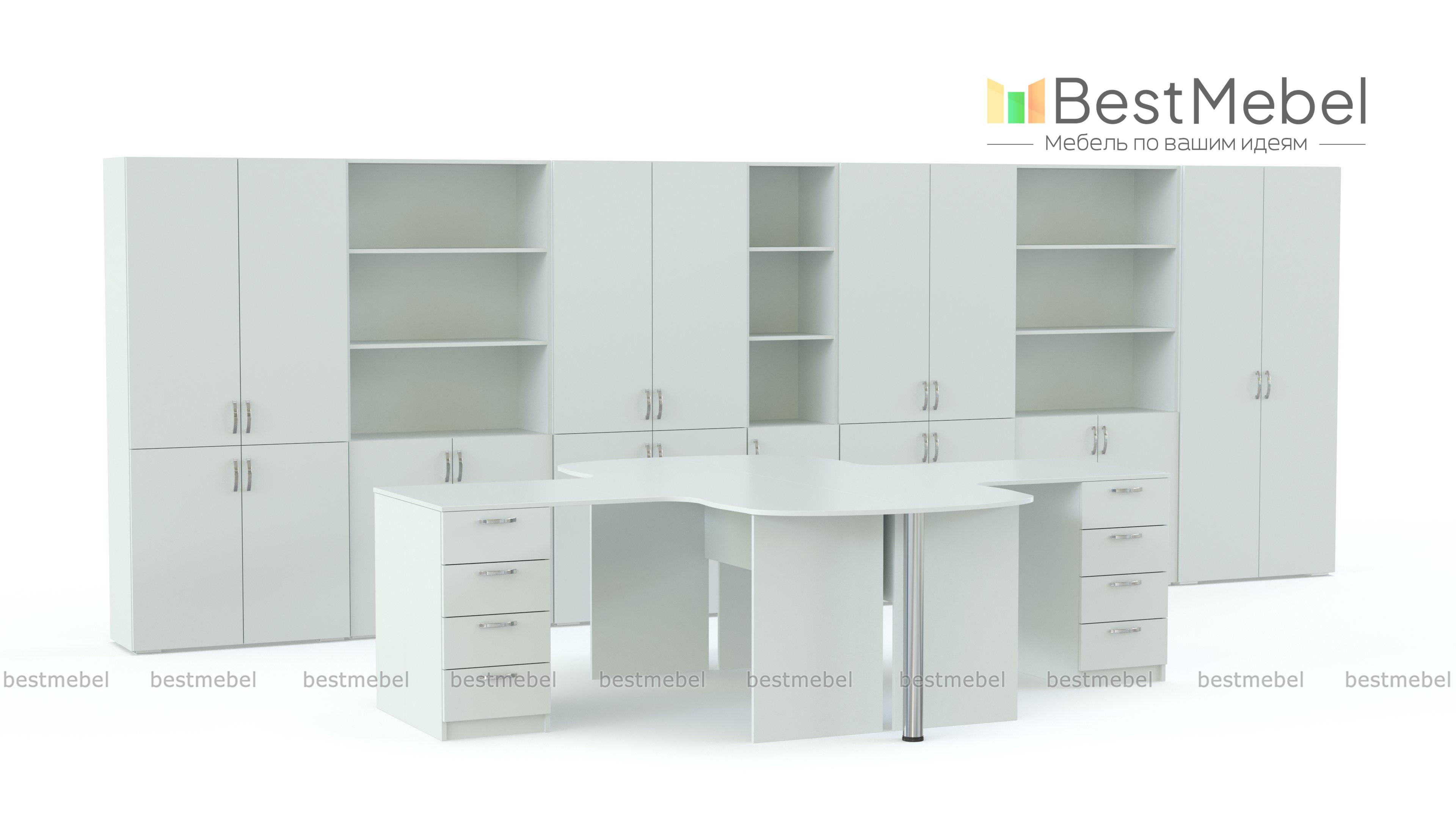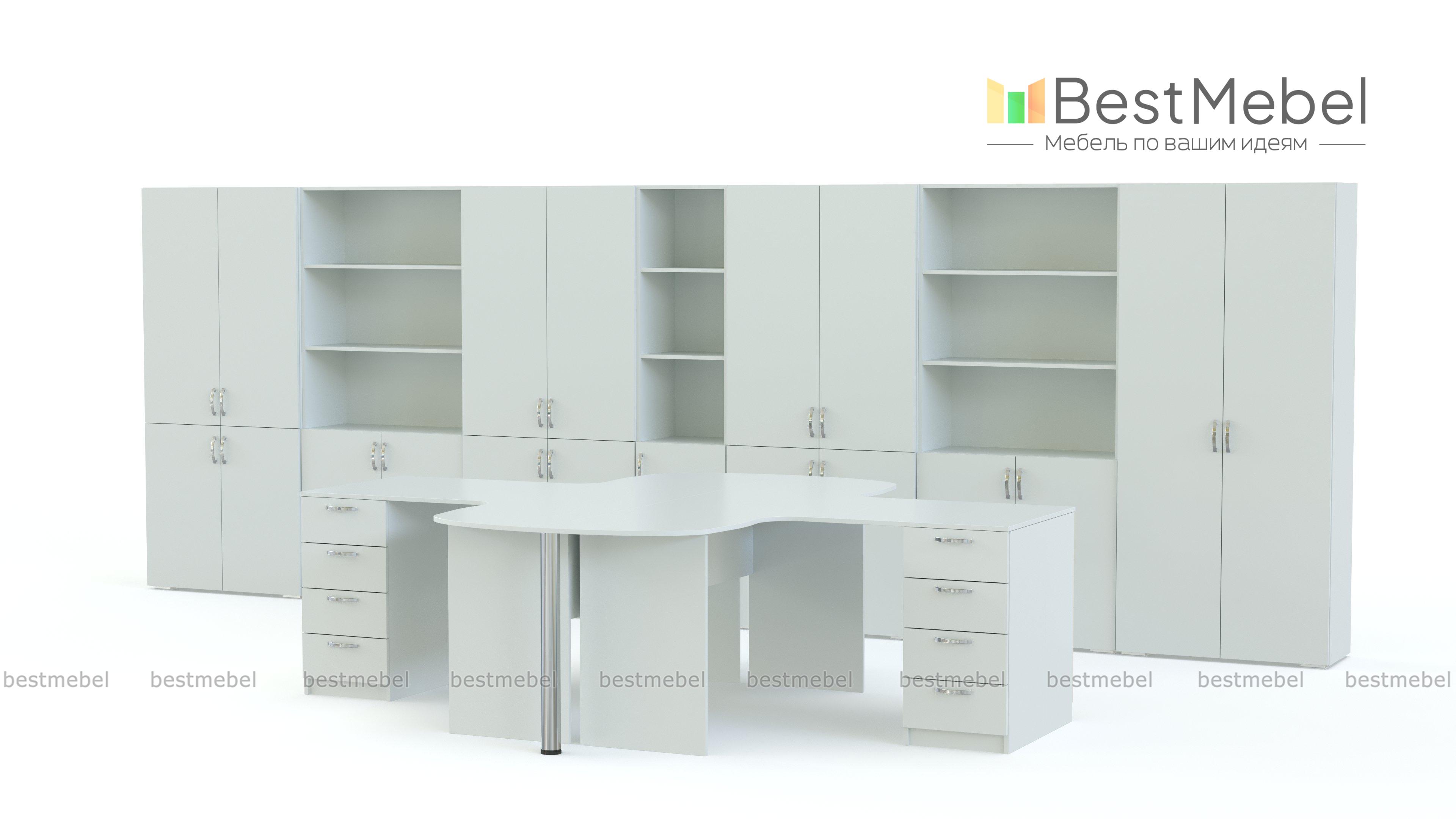 Компактный офисный комплект, где удобно разместятся сразу 4 человека. Здесь без проблем можно организовать рабочее место с персональным компьютером, ящиками для хранения документов каждого работника. Кроме того, в комплект входят стеллажи и шкафы для папок, канцелярии, книг и одежды.