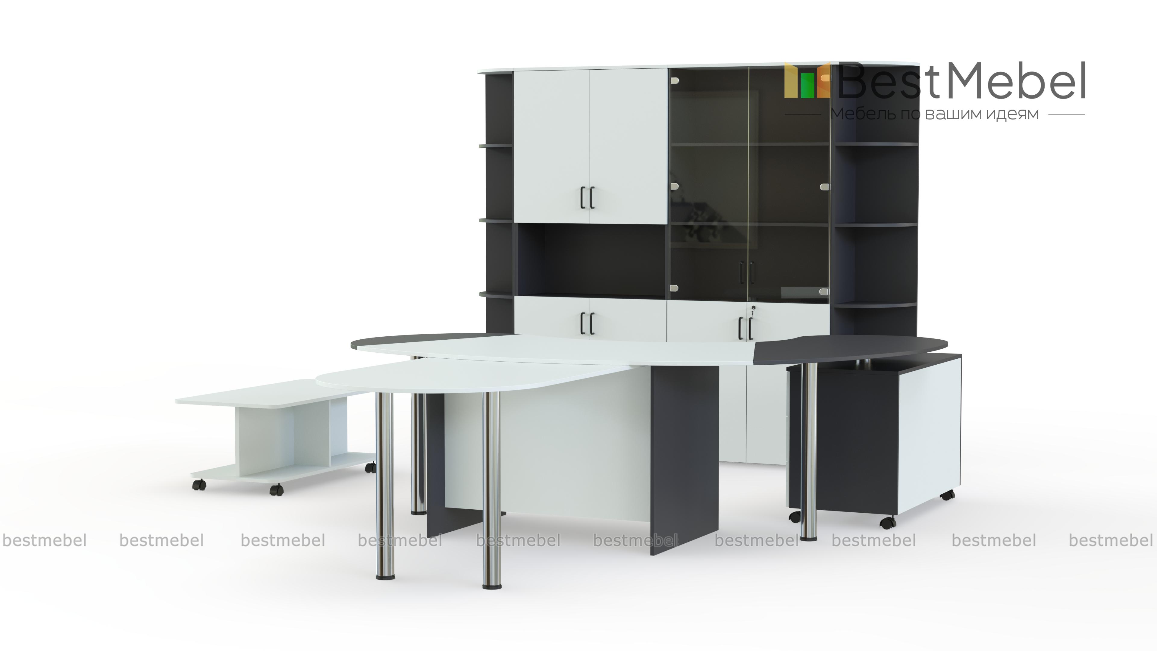 В комплект входит 2 шкафа, 2 угловые приставки, письменный стол, 2 приставных стола и журнальный столик. В кабинете будет комфортно работать, проводить небольшие совещание и принимать посетителей. Заказать комплект можно в двух цветах.