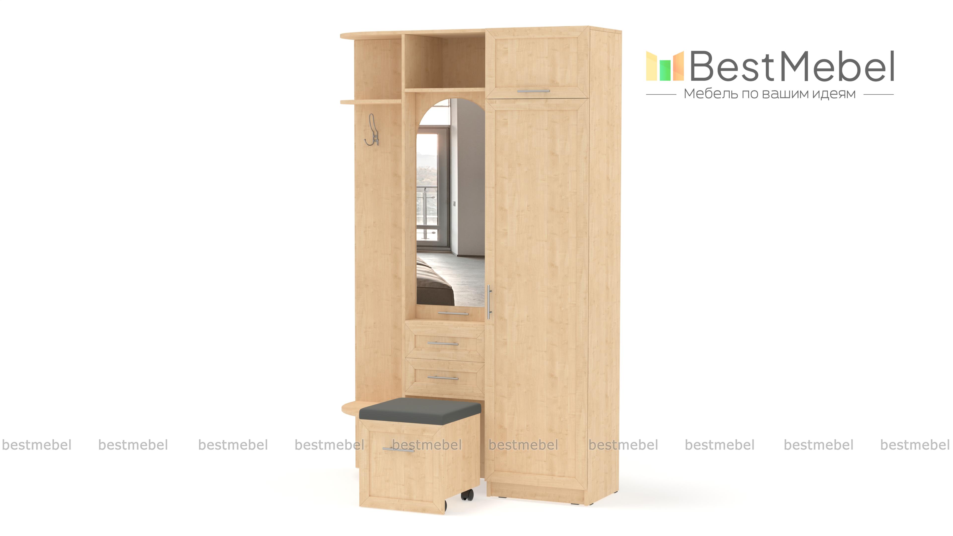 Прихожая Вика 1Б BMS с выкатным пуфом в мягкой обивке позволяет эффективно использовать пространство. Классическая композиция объединила пенал для одежды и антресоль, открытую вешалку со скругленными полками и большое, расположенное в нише зеркало, дополненное парой выдвижных ящиков. Широкие рамки на фасадах насыщенного древесного оттенка играют роль декора. Купить прихожую Вика 1Б BMS приглашаем в наш интернет-магазин с выбором фурнитуры и цвета по каталогу.