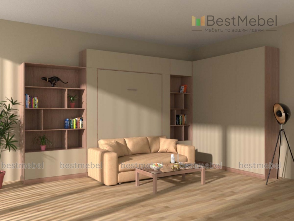 Шкаф-кровать с диваном Дино BMS – это угловая композиция в нейтральной коричнево-бежевой гамме, которая легко превратит гостиный интерьер в спальный. Композиция включает в себя трехдверный шкаф для одежды, комбинированные книжные шкафы, модуль с откидной кроватью и комфортный диван с широкими скругленными подлокотниками. Просторное спальное место дополнено боковыми полками для мелочей и мягкой спинкой. Купить шкаф-кровать с диваном Дино BMS вы сможете в нашем интернет-магазине по выгодной цене.