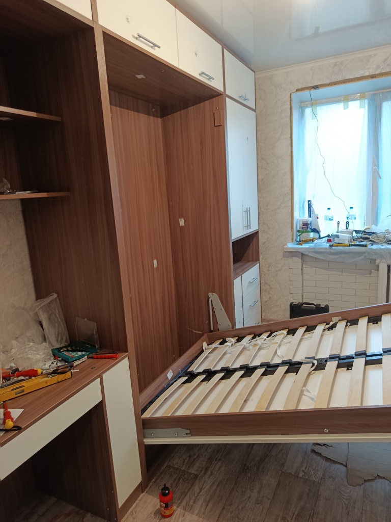 Заказ 00000226012. Изначально хотела заказать готовый проект, как на картинке, но кое-что не устраивало. Проект полностью переделали по моим хотелкам. Было бы очень удобно, если бы сидушка дивана убиралась вниз, а то приходится прятать ее в шкаф. Мебель в комнату подростку, диван превращается в кровать. С момента оформления заказа до доставки 6 дней.
