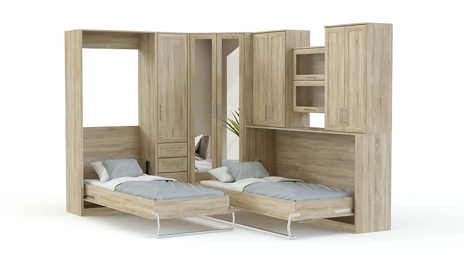 Шкаф-кровать трансформер Дуо-6 BMS поможет нестандартно подойти к организации пространства и оборудовать небольшую комнату двумя комфортными спальными местами. Угловая композиция с рамочными фасадами выполнена в светлых древесных тонах, которые делают помещение визуально просторнее. Система хранения представлена распашными отделениями, выдвижными ящиками и застекленными секциями, а практичным дополнением станут откидные кровати с вертикальным и боковым механизмом подъема. Купить шкаф-кровать трансформер Дуо-6 BMS по выгодной цене приглашаем в наш интернет-магазин.