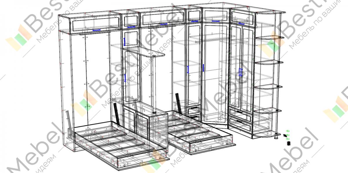 Шкаф-кровать трансформер Форман BMS – это многофункциональная стенка, которая решит проблему нехватки полезной площади. Угловая композиция с рамочными светлыми фасадами, зеркалами и хромированными опорами смотрится легкой и визуально расширяет границы комнаты. Удобная система хранения представлена распашными шкафами для одежды, выдвижными ящиками и открытыми полками, а превратить гостиную в спальню помогут два модуля с откидными кроватями, разделенные стойкой. Купить шкаф-кровать трансформер Форман BMS по лучшей цене приглашаем к нам в интернет-магазин.