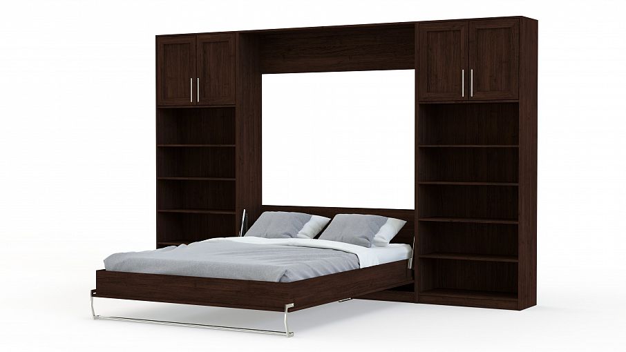 Шкаф-кровать трансформер Классика 2 BMS сэкономит полезную площадь и создаст комфортный интерьер в стиле современной классики. П-образная композиция объединила боковые секции с открытыми и глухими полками и тумбы, а в центре располагается замаскированный под дверцы модуль с откидной двуспальной кроватью. Выполненная в темных древесных тонах, стенка с рамочными фасадами и хромированной фурнитурой смотрится солидно и элегантно. Купить шкаф-кровать трансформер Классика 2 BMS и выгодно использовать особенности планировки вам поможет наш интернет-магазин.