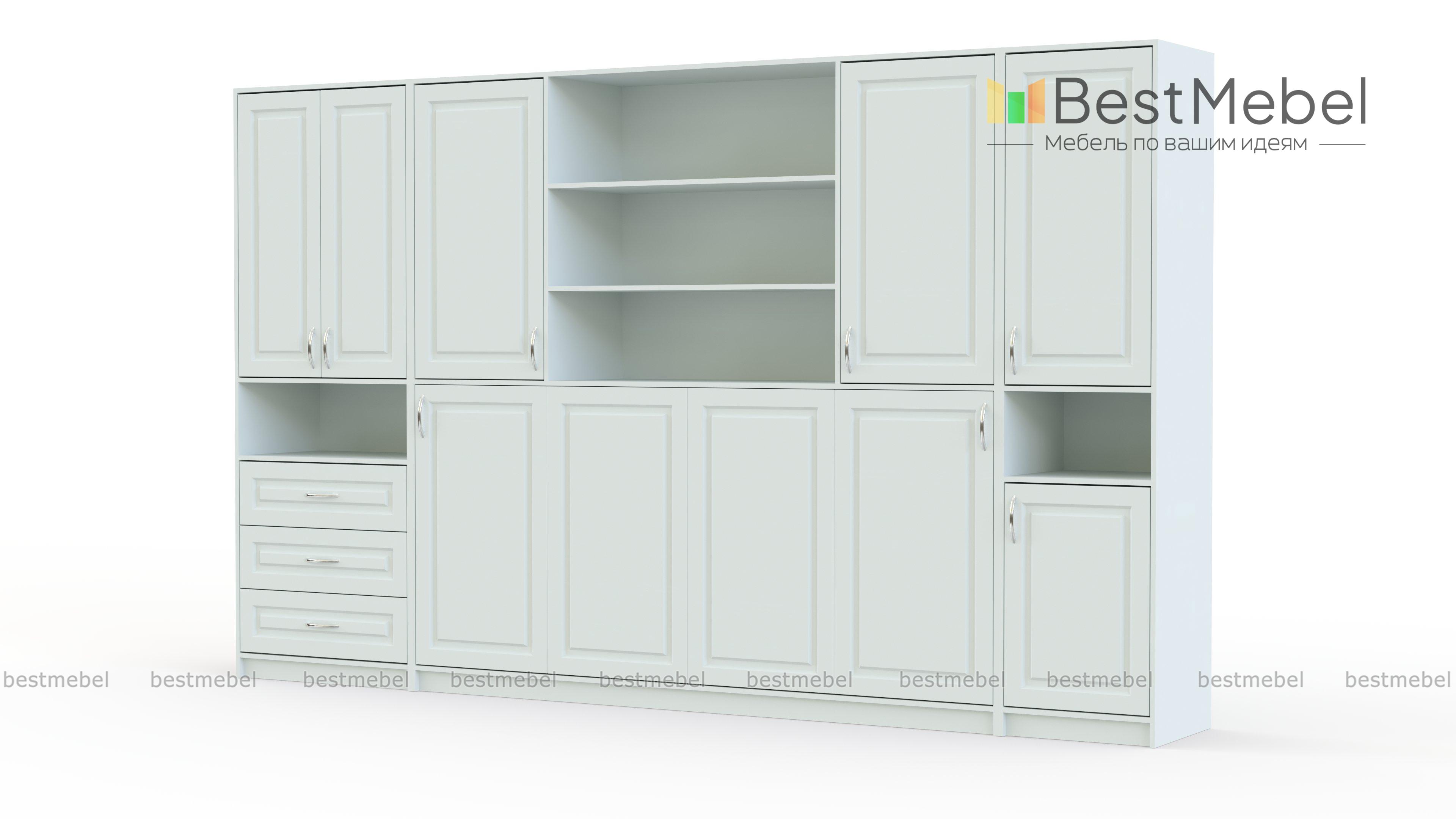 Шкаф-кровать трансформер Макси BMS – элегантная современная классика для тех, кто ценит в мебели простоту, надежность и функциональность. Стенка с белоснежными рамочными фасадами оборудована распашными отделениями, выдвижными ящиками и открытыми полками, а также откидной кроватью с горизонтальным механизмом. Конструкция оптимальна для узких помещений и поможет обустроить полноценное спальное место, дополненное полочками для мелочей. Купить шкаф-кровать трансформер Макси BMS приглашаем на сайт нашего интернет-магазина.