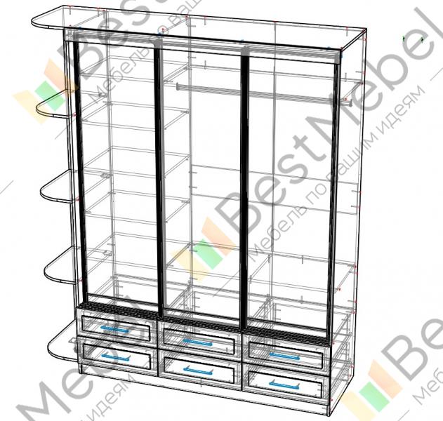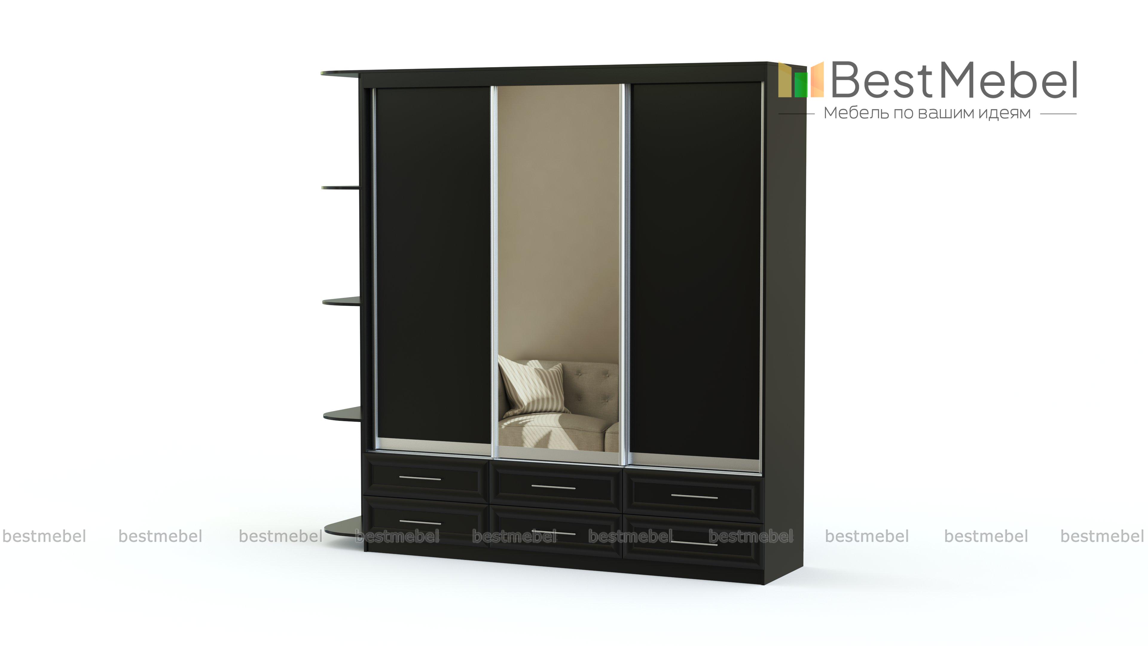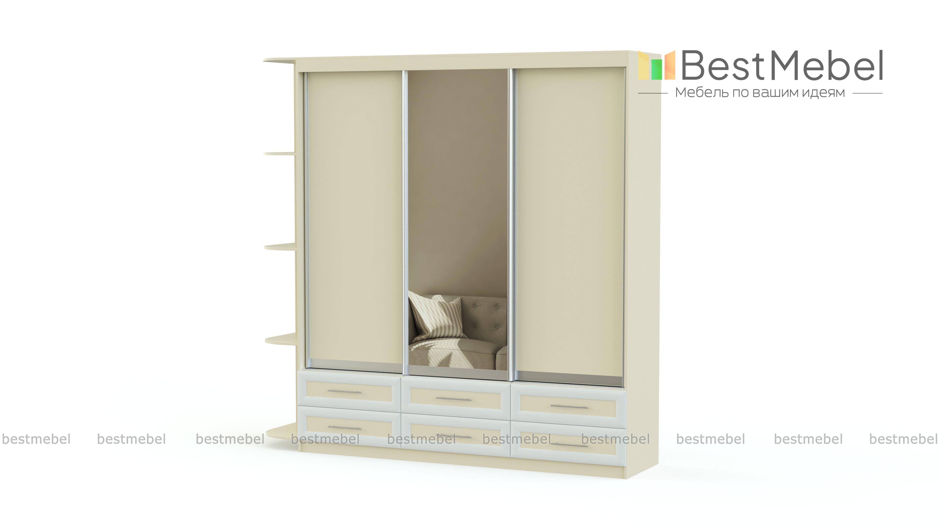 Шкаф-купе Гармония BMS предназначен для хранения для всех предметов гардероба, а также домашнего текстиля, аксессуаров и создающих уют мелочей. Трехдверное отделение-купе с зеркалом дополняют шесть выдвижных ящиков, расположенных в основании, и торцевые полки с безопасно скругленными углами. Дизайн рамочных фасадов гармонирует с другой мебелью классического оформления. Купить шкаф-купе Гармония BMS вы сможете в нашем интернет-магазине, подобрав фурнитуру и цвет по каталогу.