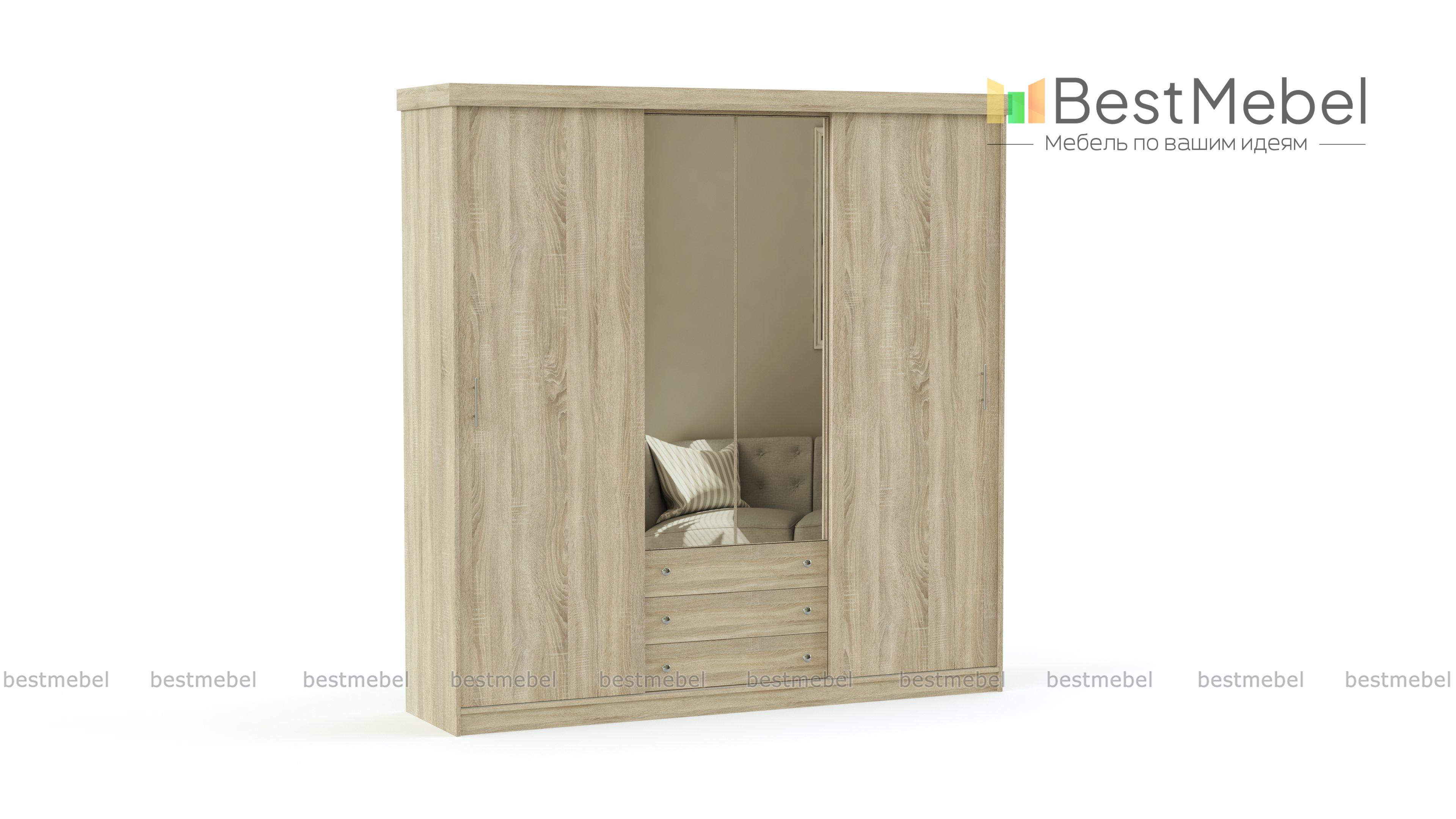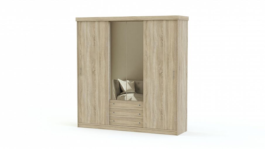 Функциональный и просторный шкаф-купе для Вашей гостиной, спальни или прихожей. Зеркала на фасаде – это не только практичный элемент, но возможность зрительно удлинить площадь комнаты. Ламинированное ДСП, из которого изготовлена корпусная мебель, повторяет фактуру дерева, добавляя ей роскоши и благородства.