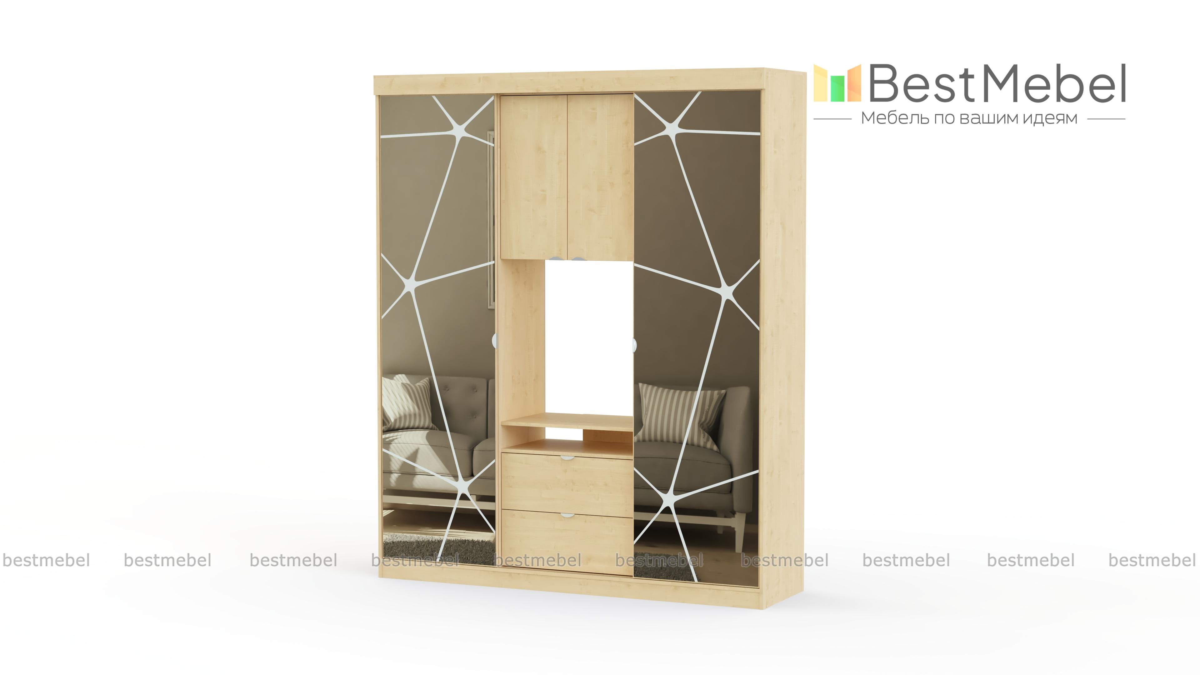 Шкаф-купе Карго – это стильная и оригинальная корпусная мебель для Вашего дома. В фасаде изделия сочетается ламинированное ДСП с фактурой дерева и зеркальные двери. Оригинальный рисунок создает иллюзию разбитого стекла. Такое изделие станет заметным элементом интерьера дома, притягивая взгляды Ваших гостей. Конструкция шкафа-купе – это просто маленький мир для всех Ваших вещей. Здесь найдется место не только для одежды и обуви, но и продуман отдел, где удобно разместится телевизор и другая техника. Это отличный вариант для небольшой квартиры, которую не хочется загромождать корпусной мебелью, оставив для своей семьи как можно больше пространства.