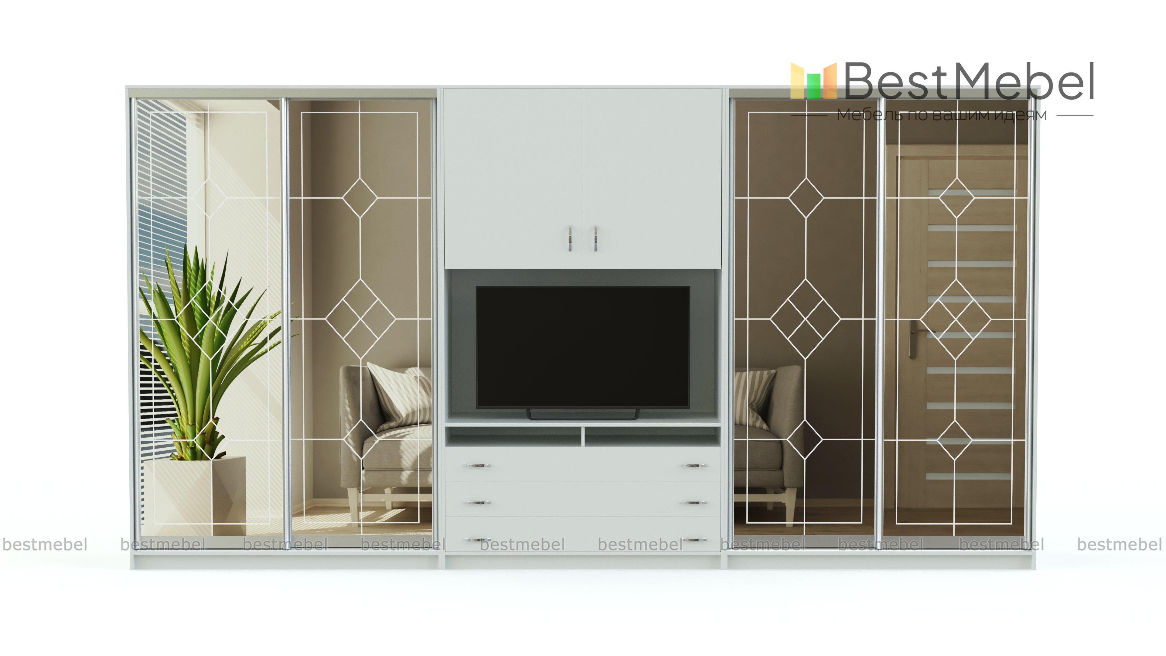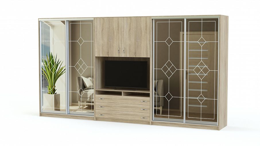 Шкаф-купе Нова 2 BMS сочетает элегантность классики и удобный функционал. В центре композиции для гостиной располагается секция под ТВ с нишей, выдвижными ящиками и распашной полкой, а по бокам - вместительные двухдверные отделения для одежды. С зеркальными фасадами комната сразу становится просторнее, в качестве декора использован изящный пескоструйный орнамент. Купить шкаф-купе Нова 2 BMS вы сможете в нашем интернет-магазине, подобрав размеры и цветовую гамму.
