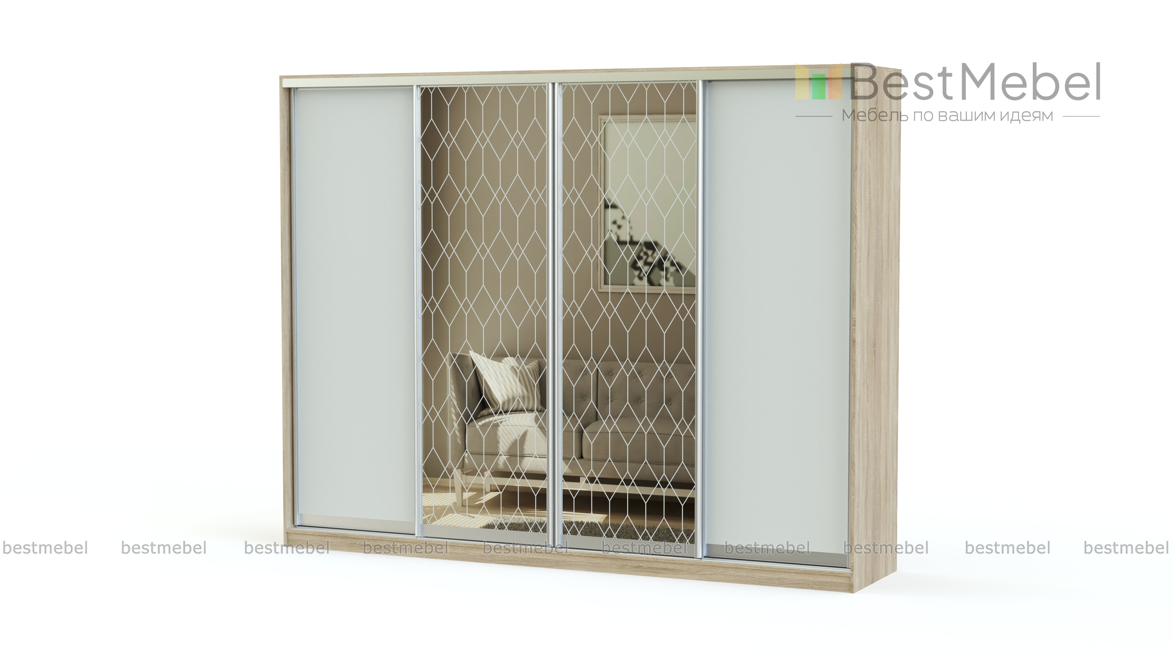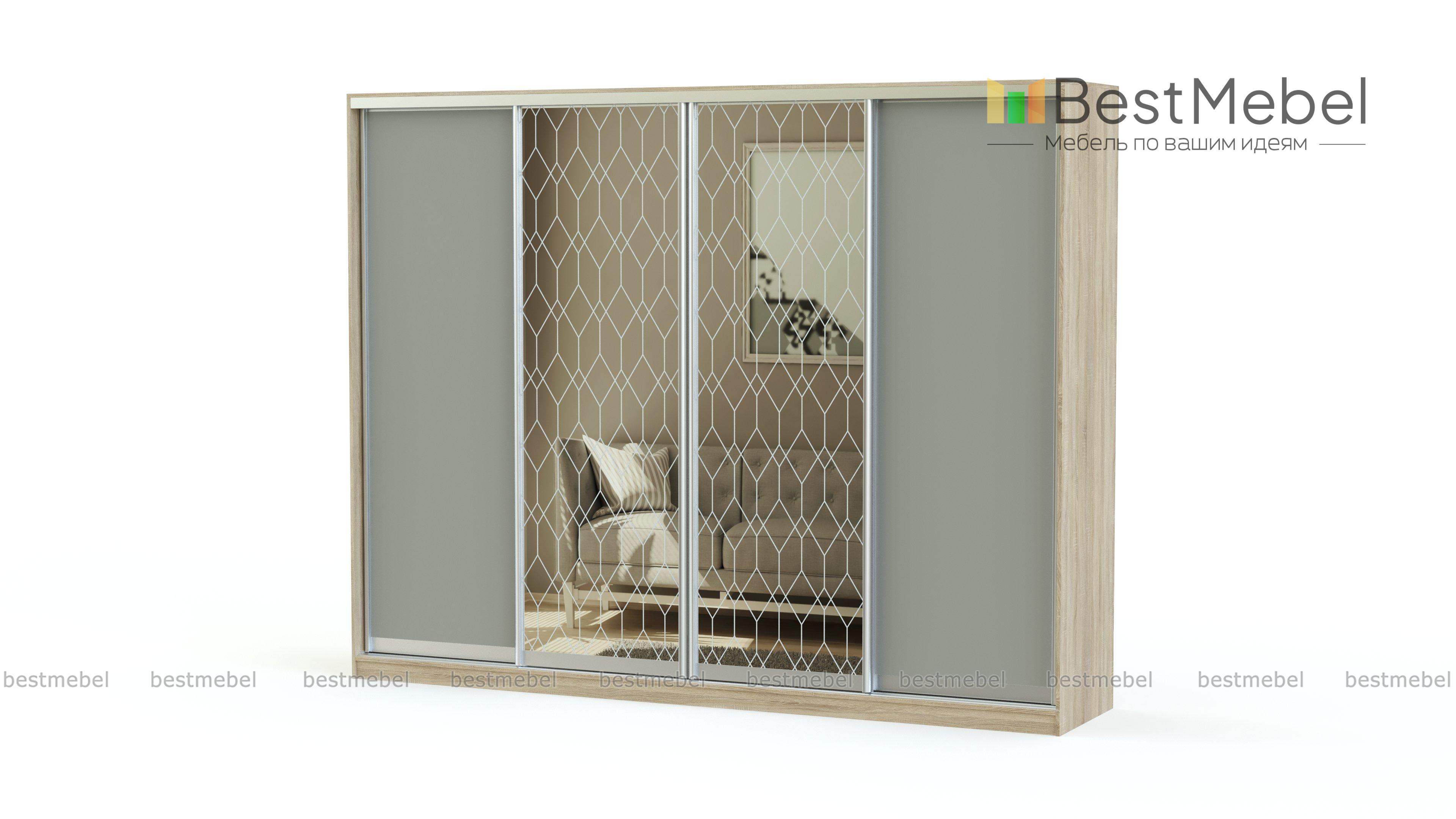 Шкаф-купе Оскар 17 BMS позволяет разместить семейный гардероб и объемные постельные принадлежности, домашний текстиль и всевозможные бытовые вещи. Габаритная четырехдверная конструкция занимает все пространство от стены до стены, но не выглядит громоздко. Боковые створки из ламинированной плиты белого оттенка скомбинированы с двумя зеркальными, украшенными изящным пескоструйным узором. Купить шкаф-купе Оскар 17 BMS и рационально организовать хранение вам поможет наш интернет-магазин.