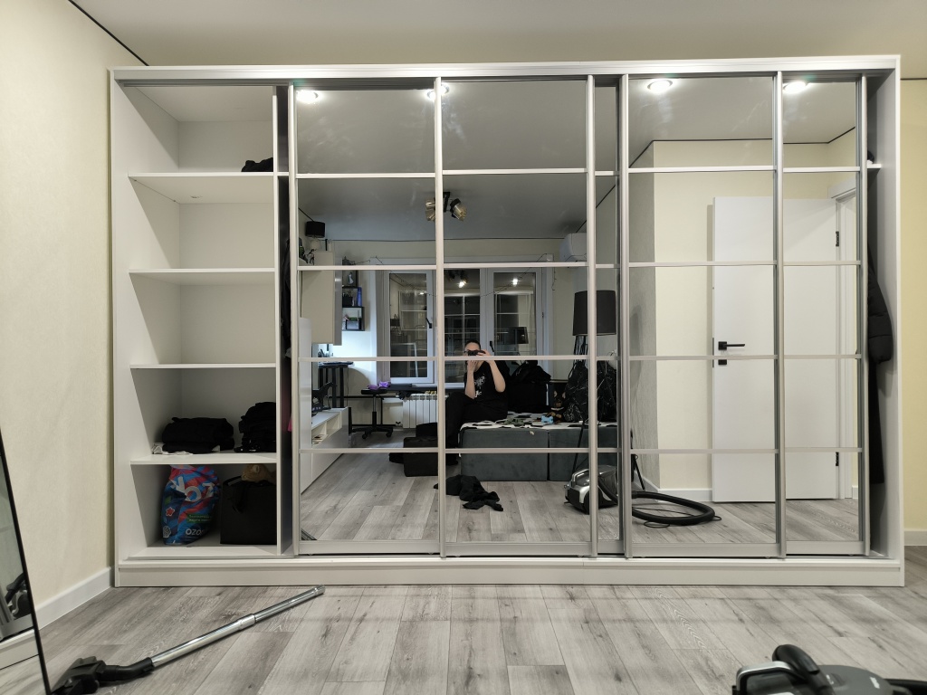 Вместительный шкаф-купе для большой и дружной семьи. Оригинальный и стильный дизайн изделия позволит ему гармонично влиться в интерьер любой комнаты, будь то гостиная, спальня или прихожая. Конструкция шкафа предусматривает вместительные полки разного размера и отделения со штангами для одежды на вешалках. При заказе на сайте можно выбрать цвет изделия и профиля из предложенных вариантов. Качественная алюминиевая профильная система обеспечивает легкое скольжение для бесшумного открывания. Организуйте аккуратное и компактное хранение вещей, купив шкаф-купе по доступной цене на нашем сайте.