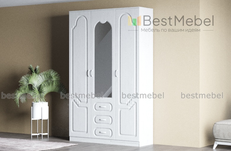 Шкаф 3-х створчатый Гармония BMS по достоинству оценят поклонники легких и светлых классических интерьеров. Выполненная в универсальном белом цвете, модель украшена изящной фрезеровкой и фигурно вырезанным зеркалом. Для аккуратного размещения белья и одежды за распашными дверцами располагаются платяное отделение со штангой и бельевые полки. Практичное дополнение – три выдвижных ящика в центральной части. Купить шкаф 3-х створчатый Гармония BMS вы всегда сможете в нашем интернет-магазине.