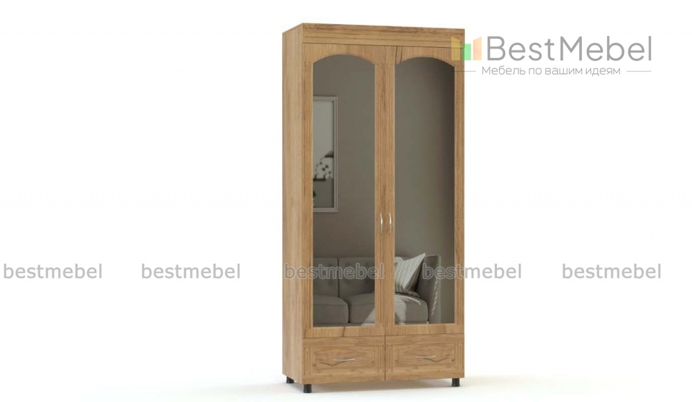 Распашной шкаф Элизабет К 3 BMS сочетает в себе достоинства классических и современных моделей. Высокий двухдверный шкаф оборудован платяным отделением со штангой и дополнен двумя выдвижными ящиками для мелочей в основании. Фасад с арочными зеркалами выполнен в теплых древесных тонах и декорирован фрезеровкой. Купить распашной шкаф Элизабет К 3 BMS для меблировки спальни, гостиной или прихожей вы всегда сможете в нашем интернет-магазине.