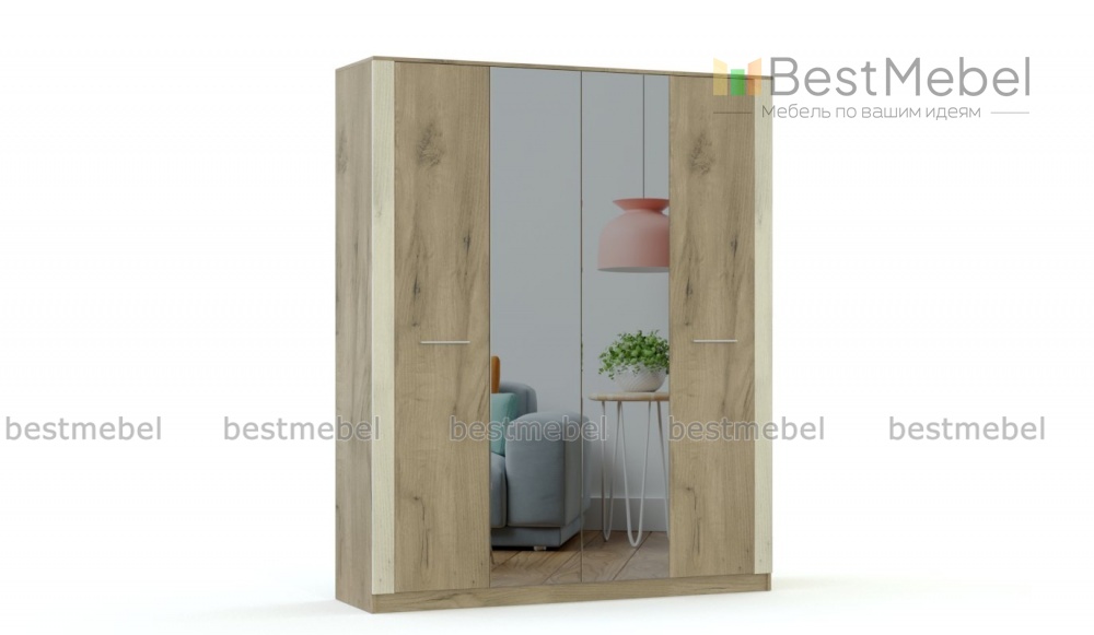 Распашной шкаф Венета BMS выполнен в светлых древесных тонах из ламинированной плиты высокого качества, а контрастный вертикальный декор зрительно вытягивает помещение в высоту. Четырехдверная модель с просторными внутренними отделениями порадует владельцев вместительностью и легко решит проблему хранения большого количества вещей. Зеркальные центральные створки удобны для примерки и придают комнате дополнительную глубину. Купить распашной шкаф Венета BMS вы сможете недорого в нашем интернет-магазине.