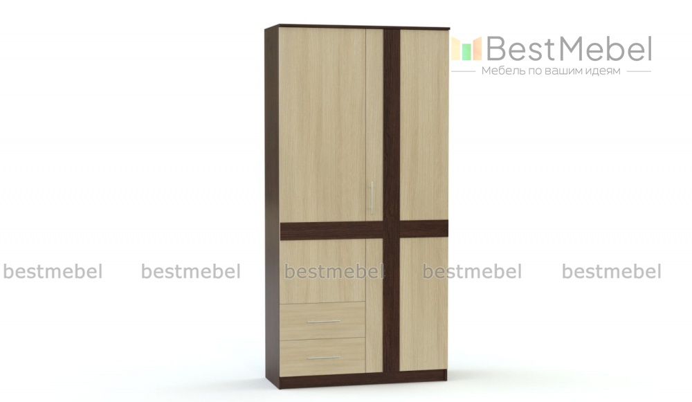 Распашной шкаф Зоя 1 BMS с геометричным декором фасада дополнит другие предметы серии или станет ярким акцентом в интерьере. Двухдверная модель отличается компактными размерами, а особенную вместительность ей обеспечивает комбинированная конструкция с двумя выдвижными ящиками. Шкаф выполнен из качественной ламинированной плиты в контрастных древесных тонах и будет долго радовать вас эстетичным внешним видом. Купить распашной шкаф Зоя 1 BMS по доступной цене вы сможете на сайте нашего интернет-магазина.