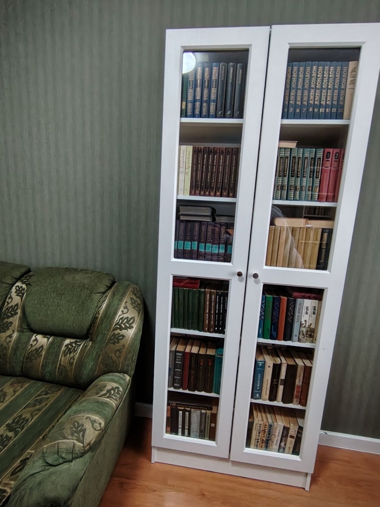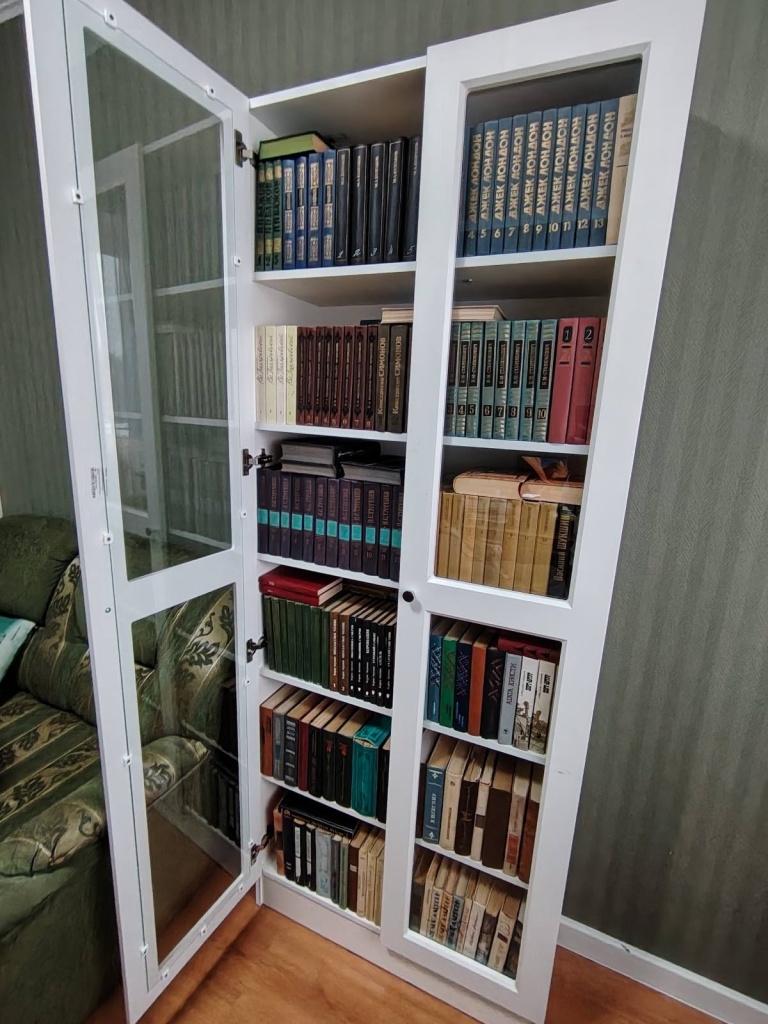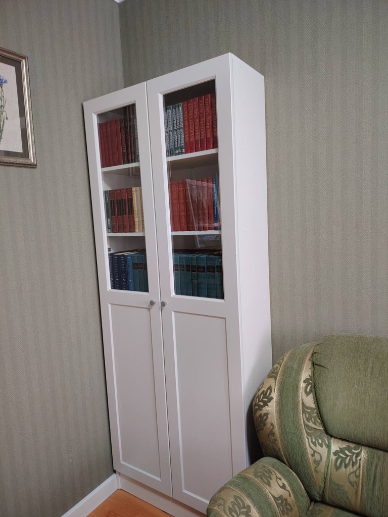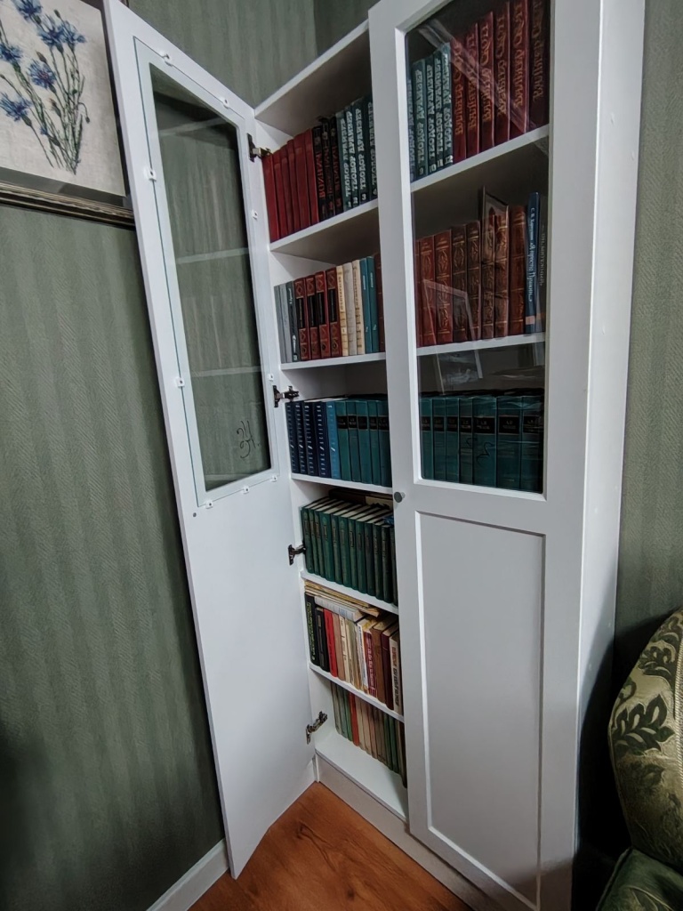 Шкаф в выбранном цвете смотрится шикарно. Из-за того, что книги очень высокие, пришлось менять высоту полок (что-то заранее сделали, что-то на месте). Понравилось, что можно менять конструкцию и даже что-то вне указанного (та же высота полок).