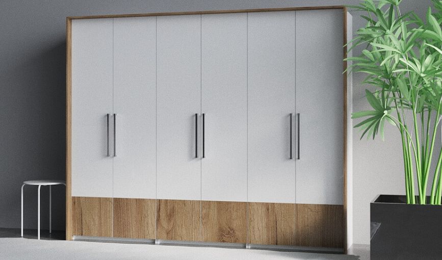 Шкаф Ника 6 BMS – это крупногабаритная, но при этом визуально легкая модульная композиция для современного спального интерьера. Три просторных распашных отделения, оборудованных полками штангами, смогут разместить одежду на плечиках, постельные принадлежности и сезонные вещи, разгрузив другие помещения дома от лишней мебели. Выполненный в белом цвете фасад декорирован вставками крафтовых древесных оттенков. Купить шкаф Ника 6 BMS и оптимизировать хранение вам поможет наш интернет-магазин.