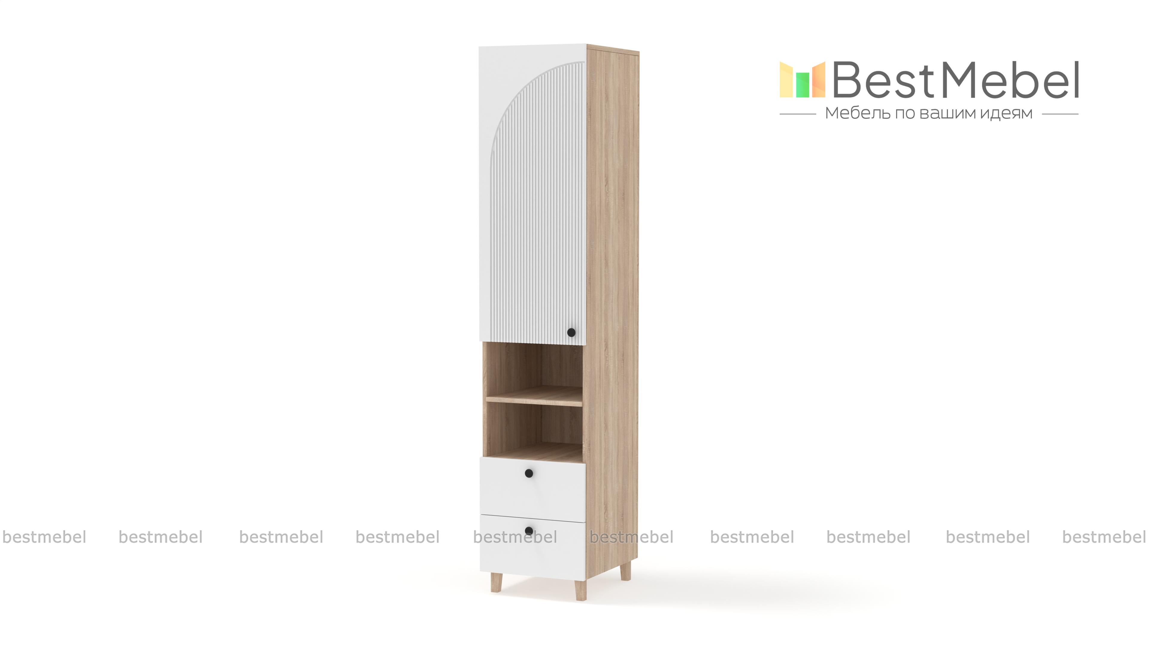 Шкаф-пенал Вивьен 5 BMS — небольшой и функциональный, отлично смотрится и в детской, и в гостиной. Древесного оттенка корпус с высокими ножками, изготовленный из ЛДСП, дополняет стильный фактурный фасад. Для удобного хранения конструкцией предусмотрены вместительное распашное отделение, ниша с полкой и два выдвижных ящика, расположенных снизу. Купить шкаф-пенал Вивьен 5 BMS с выбором размеров, цвета и фурнитуры вы сможете на сайте нашего интернет-магазина.
