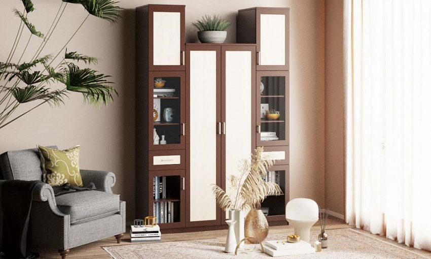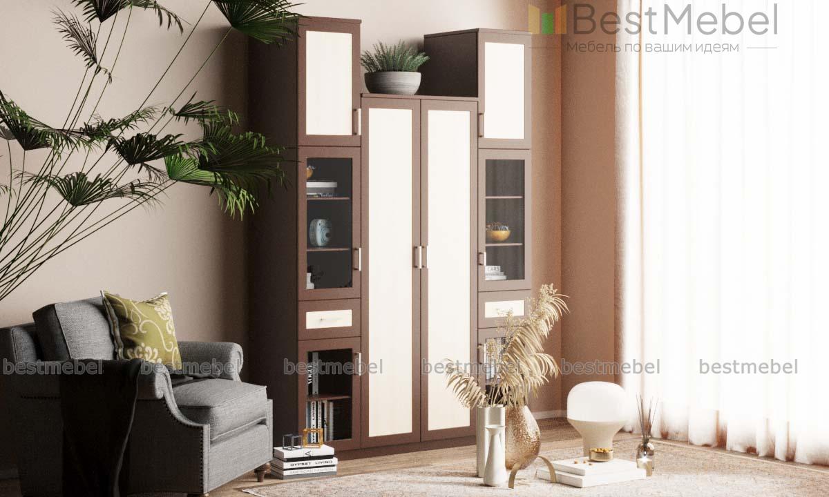 Шкаф распашной Фауст 1 BMS – это комбинированная модель, которая может дополнить спальный интерьер или станет альтернативой стенке в гостиной. Разноуровневая композиция объединила двухдверный платяной шкаф и два симметрично расположенных пенала с посудными витринами, выдвижными ящиками для мелочей и глухими антресолями. Рамочные фасады шкафа выполнены в контрастных древесных тонах. Купить шкаф распашной Фауст 1 BMS по выгодной цене приглашаем в наш интернет-магазин.