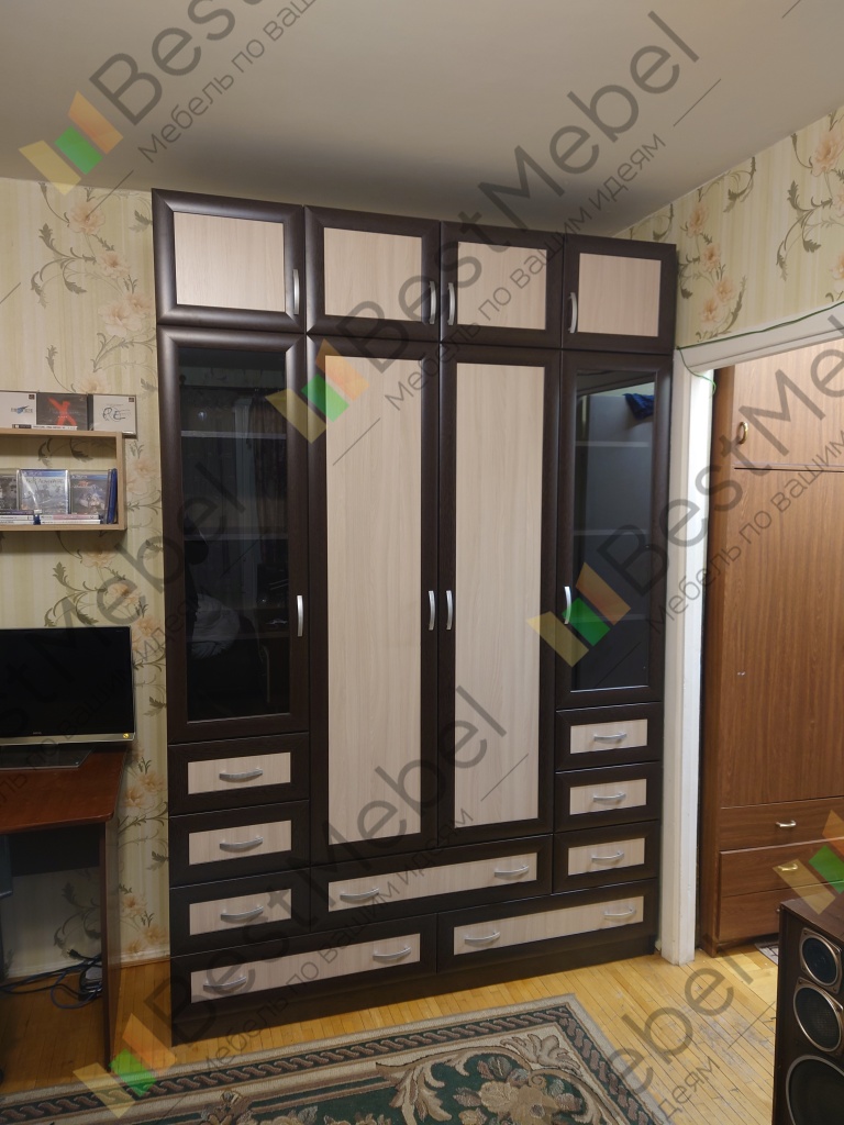 Шкаф распашной Фауст 6 BMS – это удобная система хранения для современной гостиной. Комбинированная модель оборудована двухдверным платяным отделением, распашными посудными витринами, тремя большими и шестью малыми выдвижными ящиками для белья и мелких вещей, а также вместительной антресолью. Благодаря рамочным фасадам в контрастных древесных тонах шкаф выглядит элегантно и надолго сохранит эстетичный вид. Купить шкаф распашной Фауст 6 BMS и легко поддерживать дома порядок вам поможет наш интернет-магазин.