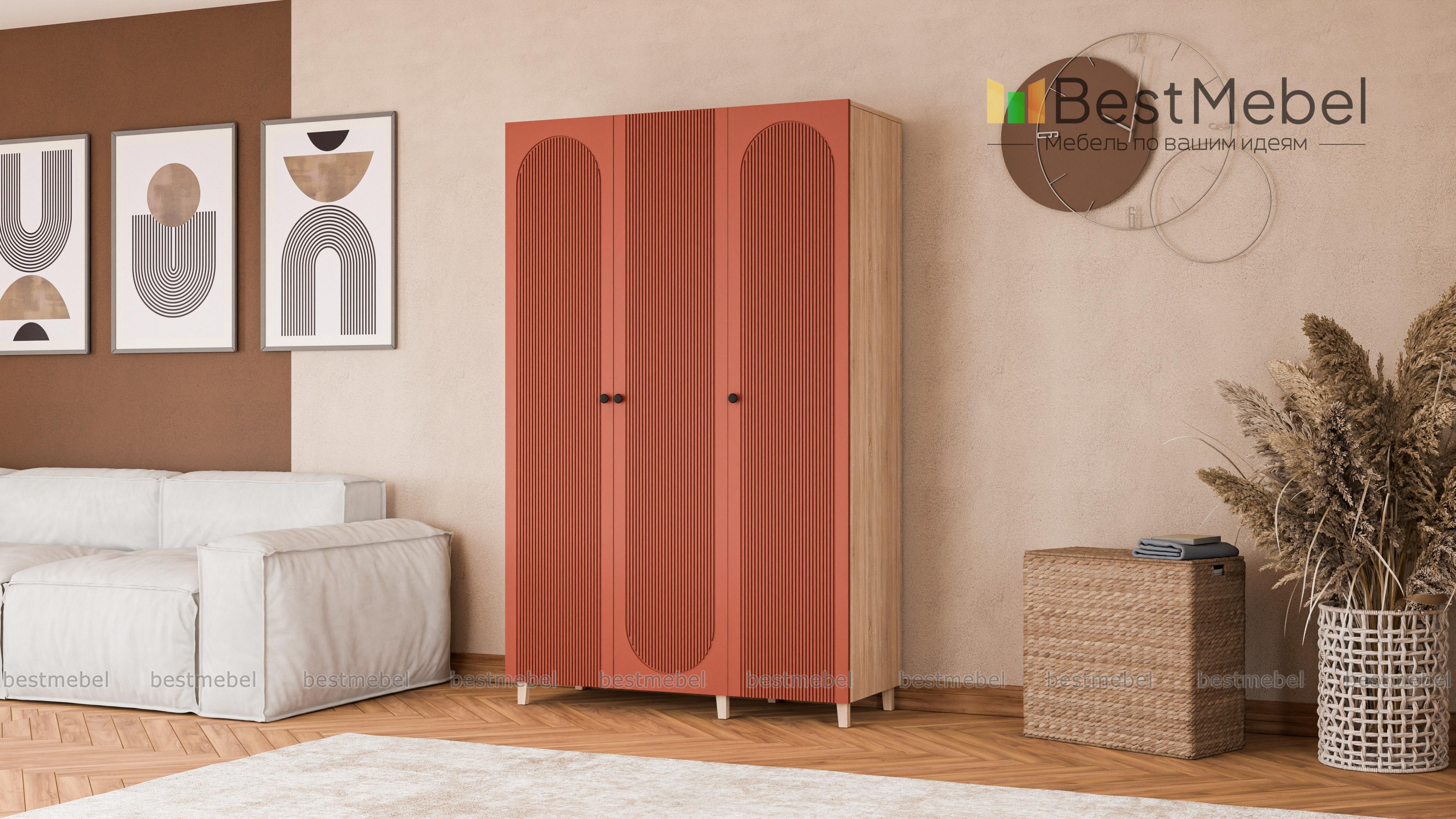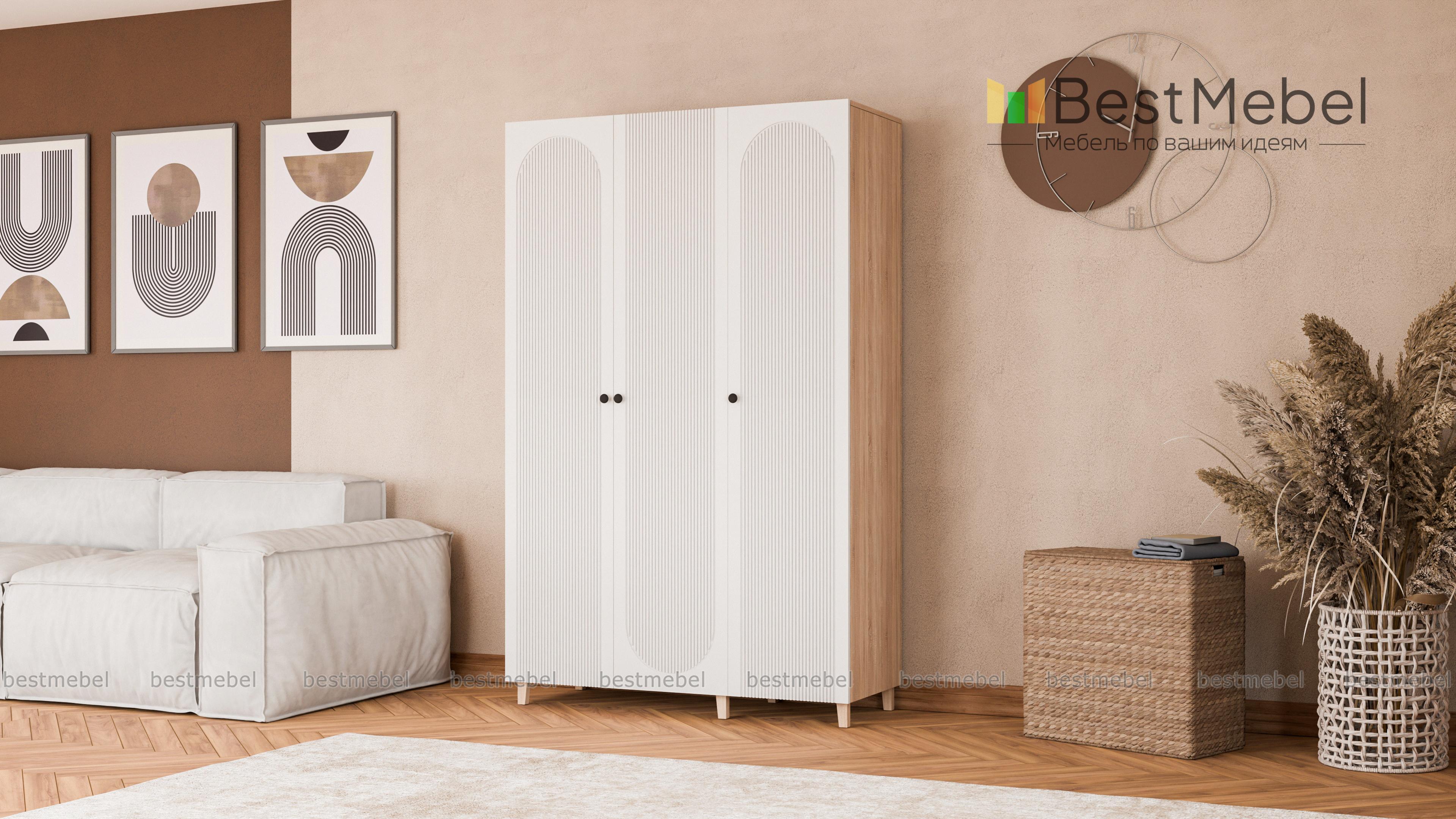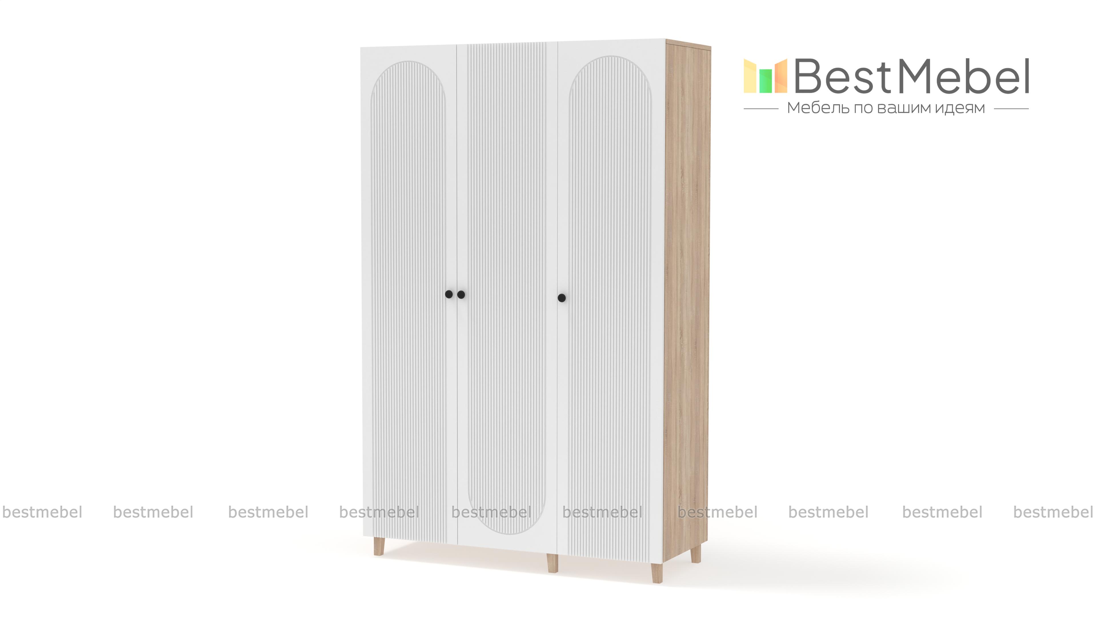Шкаф распашной Рене 21 BMS в светлом оттенке станет универсальным выбором для разных по стилю интерьеров. Визуально легкая за счет высоких ножек конструкция имеет три распашные дверцы, за которыми скрыты платяная штанга и полки для одежды. Особенность дизайна этой современной модели — изящная фрезеровка фасада с полукруглыми вырезами. Купить шкаф распашной Рене 21 BMS вы сможете недорого в нашем интернет-магазине с индивидуальным подбором размеров, цвета и фурнитуры.