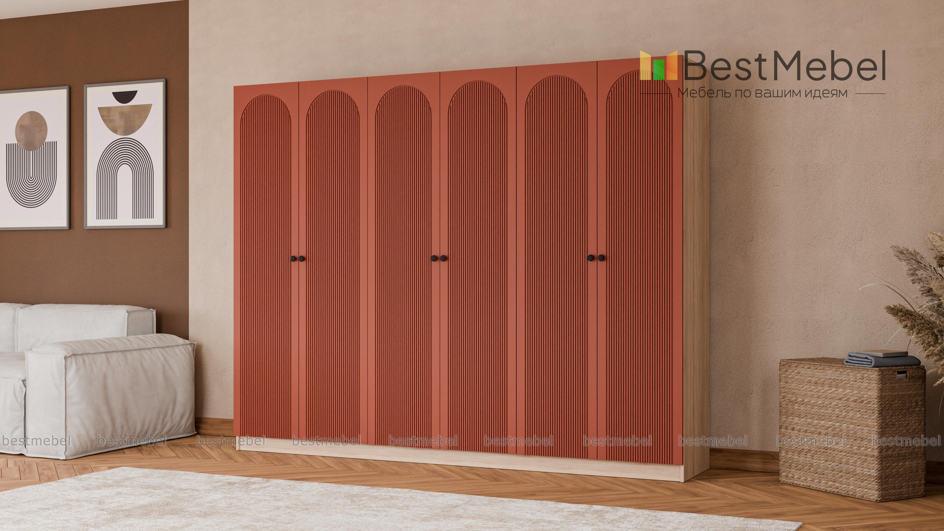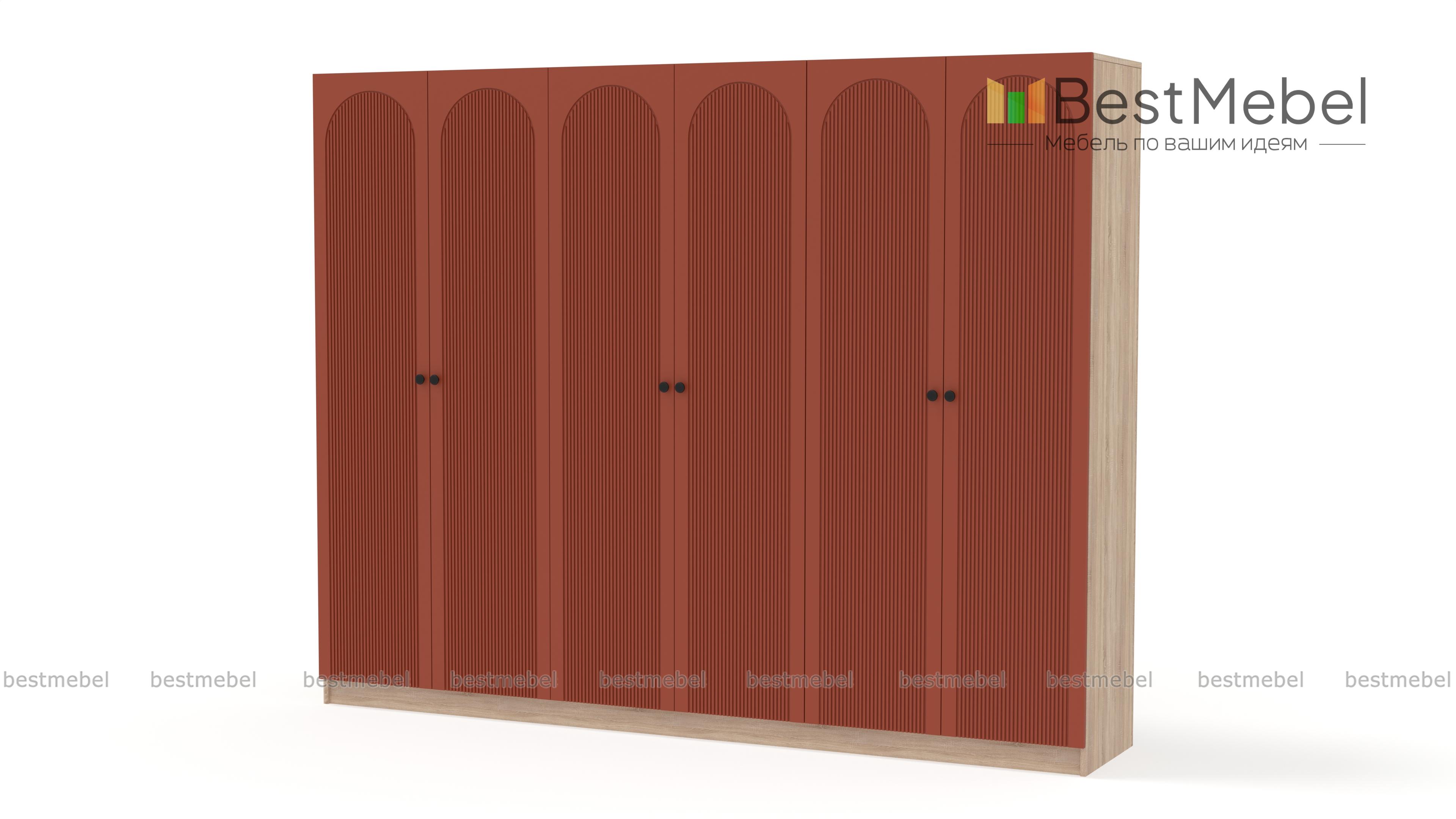 Шкаф распашной Рене 35 BMS — это отличная вместительность трех платяных отделений и современная эстетика. Фасад шестидверной модели с арочным декором и фрезеровкой красиво сочетается с корпусом в древесных тонах. Качественные материалы — ламинированная плита и МДФ, и надежная фурнитура делают пользование комфортным и долговечным. Купить шкаф распашной Рене 35 BMS вы сможете на сайте нашего интернет-магазина с изготовлением по индивидуальным размерам.