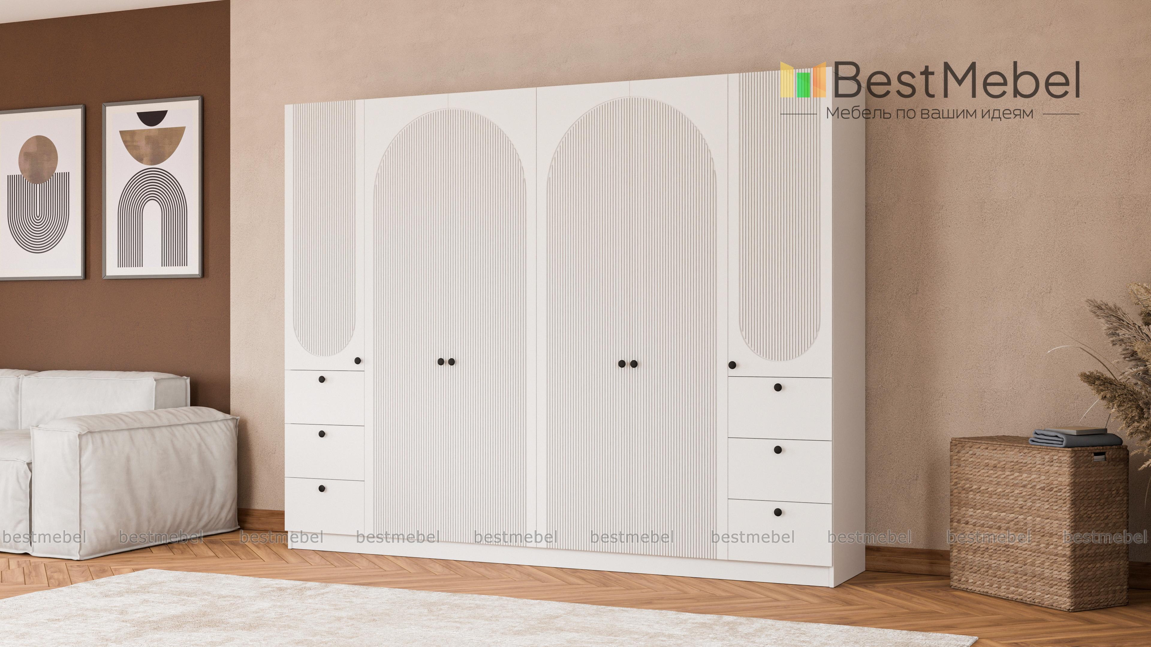 Шкаф распашной Вивьен 19 BMS с двумя платяными отделениями и двумя комбинированными легко и удобно разместит семейный гардероб. Габаритная конструкция для просторной спальни или прихожей оборудована штангами, бельевыми полками и шестью выдвижными ящиками. На фасаде из МДФ актуального оттенка — оригинальная геометричная фрезеровка и контрастные круглые ручки. Купить шкаф распашной Вивьен 19 BMS с изготовлением по индивидуальным размерам вы сможете на сайте нашего интернет-магазина.