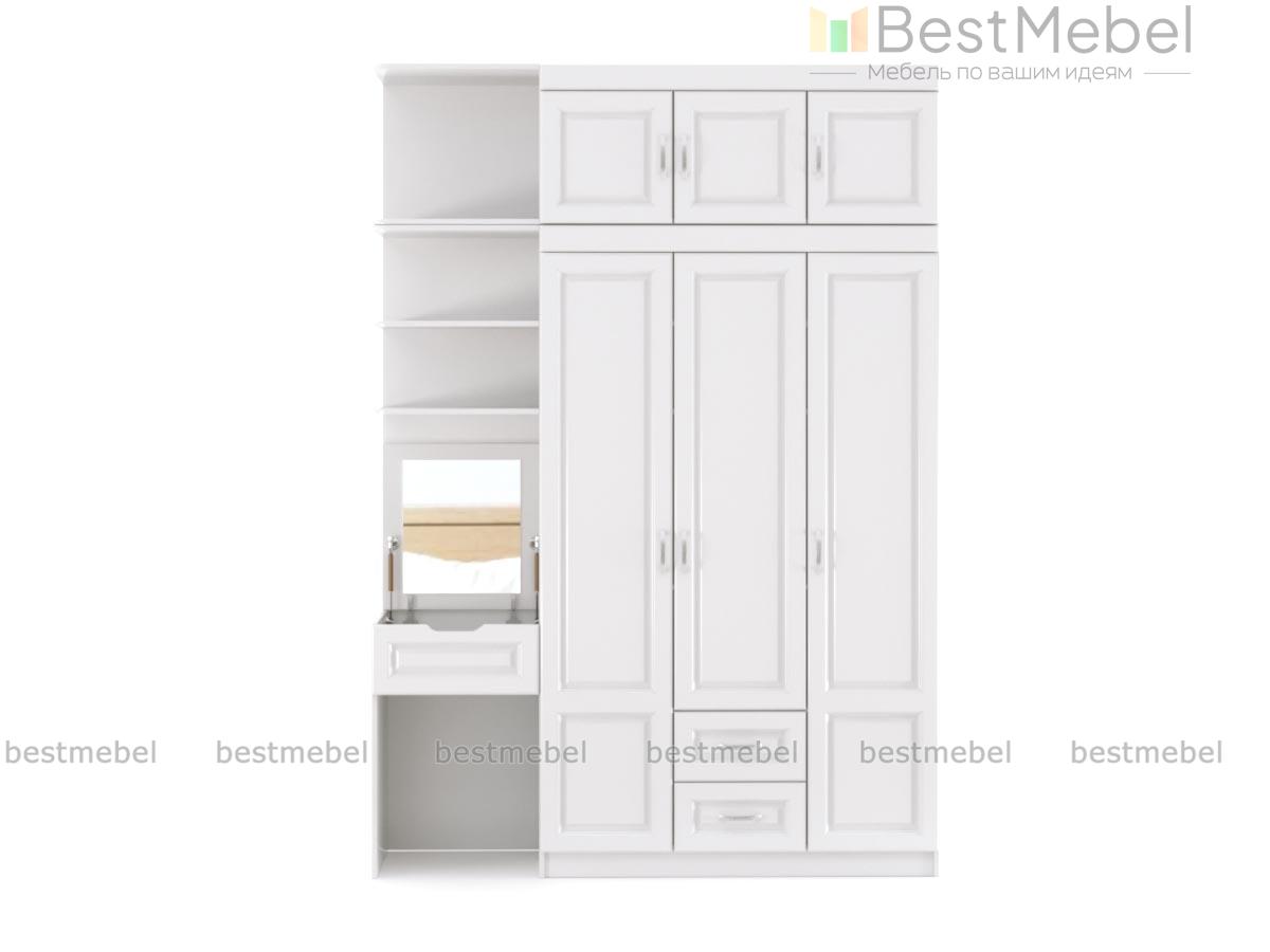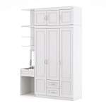 Шкаф со столом Лея 2 BMS поможет вам разместить одежду, сезонные вещи, бытовые мелочи и все необходимое для ухода за собой. Многофункциональная модель объединила трехдверный платяной шкаф с выдвижными ящиками и антресолью, туалетный столик с откидной столешницей, банкетку и просторные открытые полки. Выполненный в белом цвете и декорированный рамочной фрезеровкой, шкаф делает комнату визуально светлее и просторнее. Купить шкаф со столом Лея 2 BMS приглашаем в наш интернет-магазин.