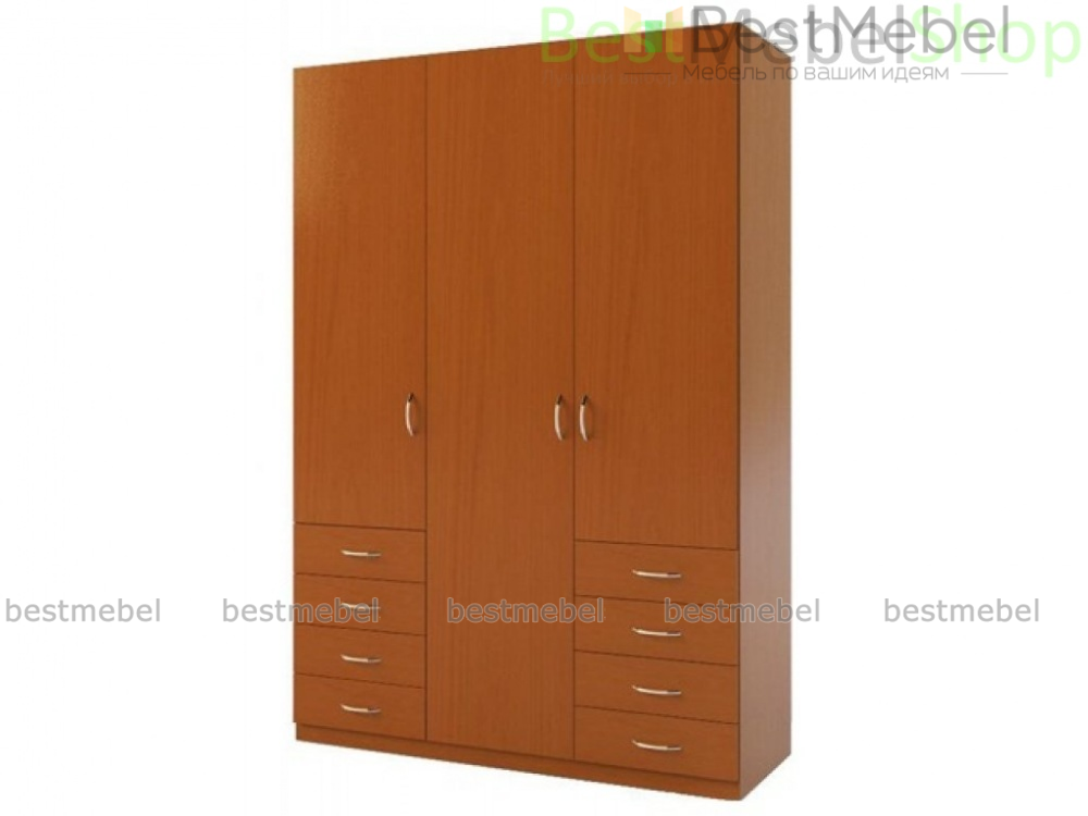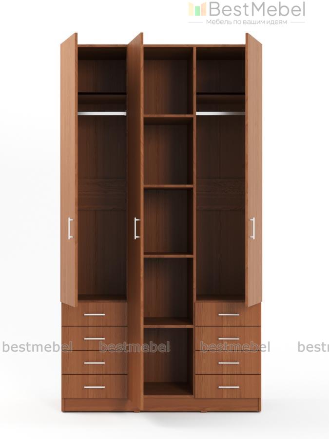 Шкаф распашной Зодиак 3.8 BMS - недорогой и практичный вариант для спальни или прихожей. Три распашных отделения, оснащенных полками и штангой, и восемь выдвижных ящиков помогут каждой вещи в гардеробе найти свое место. Корпус и лаконичный фасад шкафа выполнены из ламинированной плиты древесных оттенков - современного износостойкого материала. Купить шкаф распашной Зодиак 3.8 BMS приглашаем в наш интернет-магазин с выбором размеров, цвета и фурнитуры.