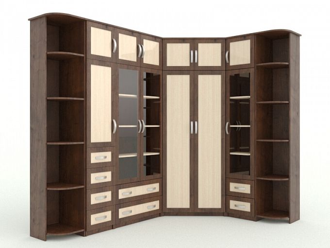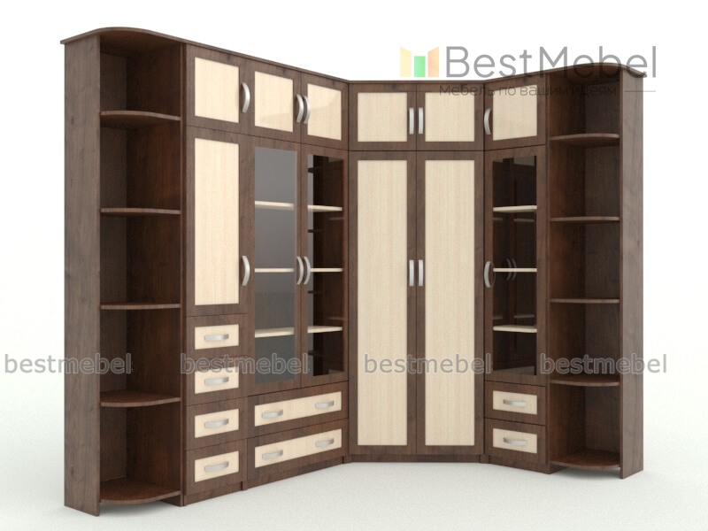 Шкаф угловой МТК-3 BMS станет элегантным дополнением гостиной в классическом стиле. Вместительная модель выполнена в контрастных древесных тонах с рамочными фасадами и оборудована отделениями разного типа для максимально удобного размещения одежды, книг, предметов декора и множества мелочей. В комплект входят угловой двухдверный шкаф с платяным отделением, витрины, выдвижные ящики, глухой шкафчик с полками, симметричные торцевые стеллажи и просторная антресоль. Купить шкаф угловой МТК-3 BMS вы сможете в нашем интернет-магазине.