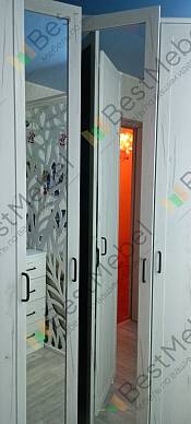 Заказ № 00000849901. Заказали шкаф размером 3000*2200*50. Выбрали расцветку сочетающуюся с комодом с этого же сайта. Ручек таких же как у комода в предложенных вариантах не было, но нам пошли навстречу и прислали именно их. Огромное спасибо за это. Собирали сами. Инструкция мелковата, но разобрались. По итогу получились 1 угловой шкаф и 3 пенала которые потом скрепили друг с другом стяжками, но при желании их можно ставить и отдельно друг от друга. Шкафы довольно вместительные. Качество зеркал хорошее, 2 дверцы шкафа состоят из зеркал в рамках. В общем шкаф замечательный.