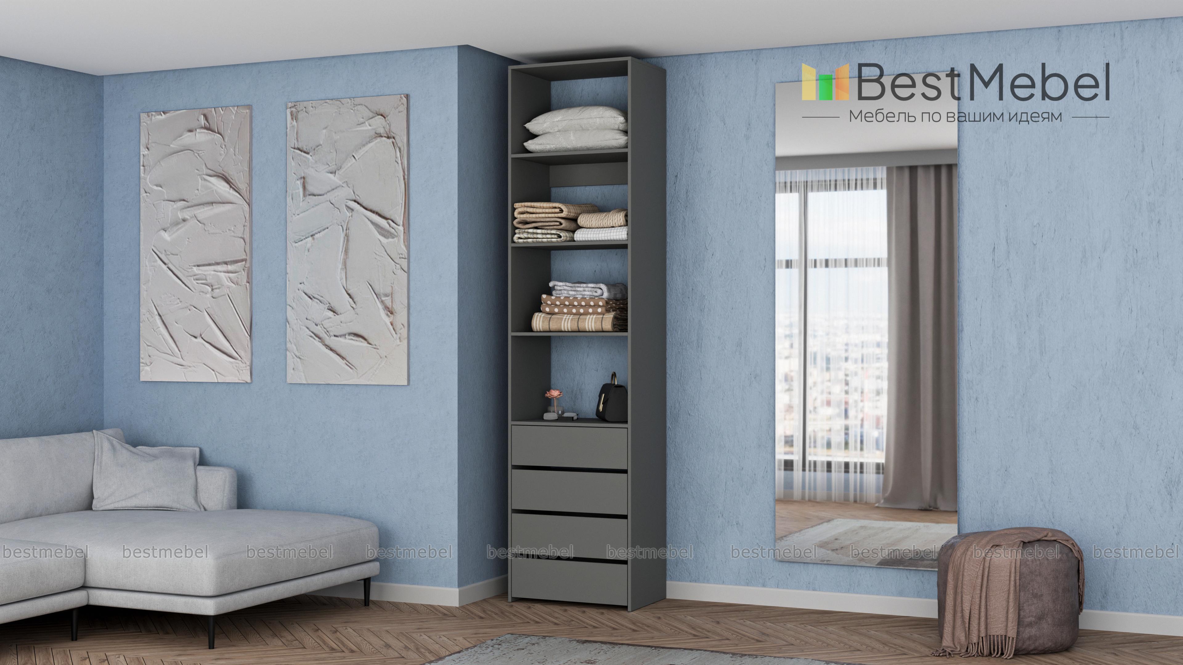Стеллаж для одежды Мирта 35 BMS может дополнить другие стеллажи серии или использоваться самостоятельно. Три бельевые полки сверху дополнены четырьмя выдвижными ящиками для трикотажа, аксессуаров и прочих мелких вещей. Узкий стеллаж легко вписывается в ниши, маленькие спальни, прихожие или гардеробные, решая проблему ограниченного пространства. Купить стеллаж для одежды Мирта 35 BMS приглашаем в наш интернет-магазин в любом размере и оттенке из каталога.